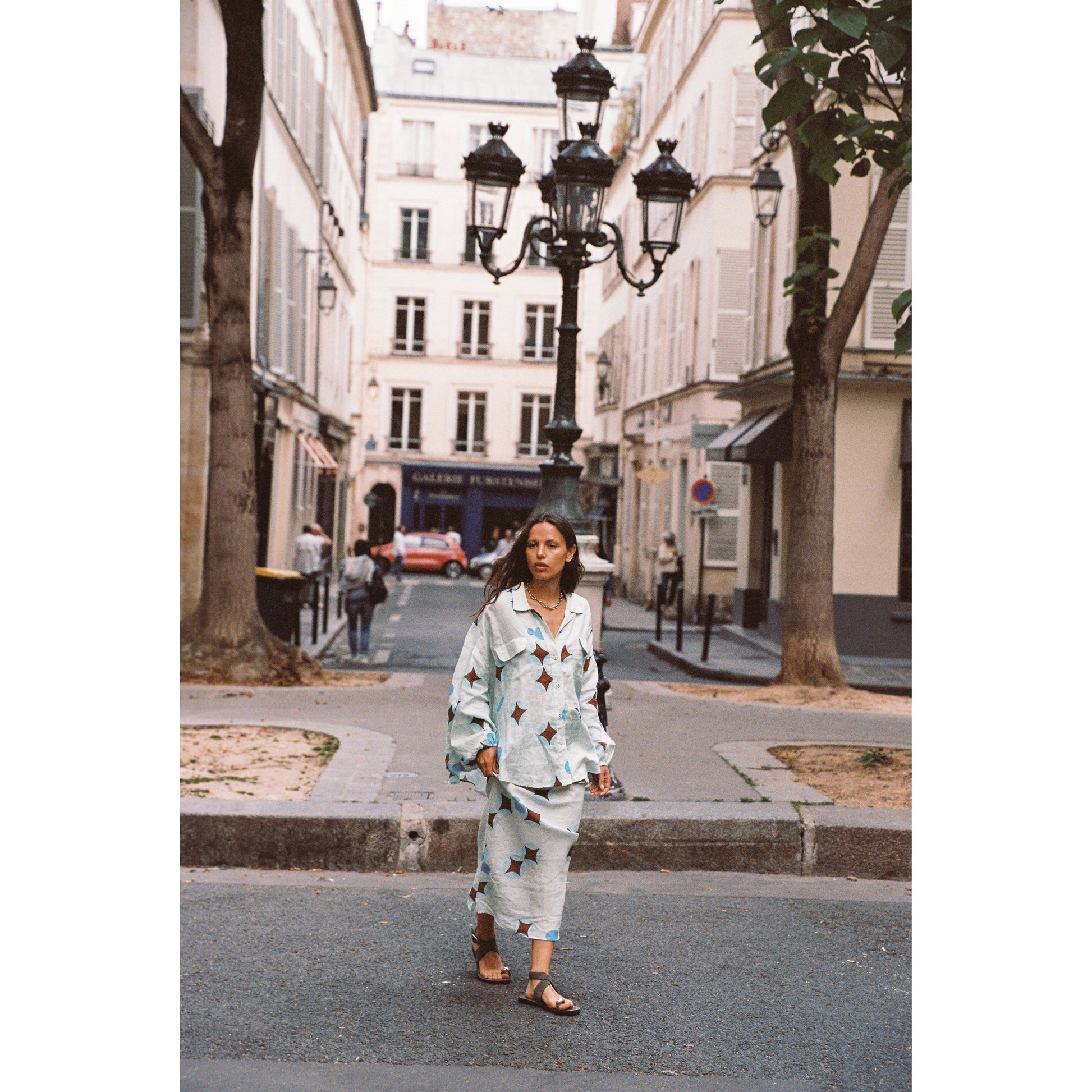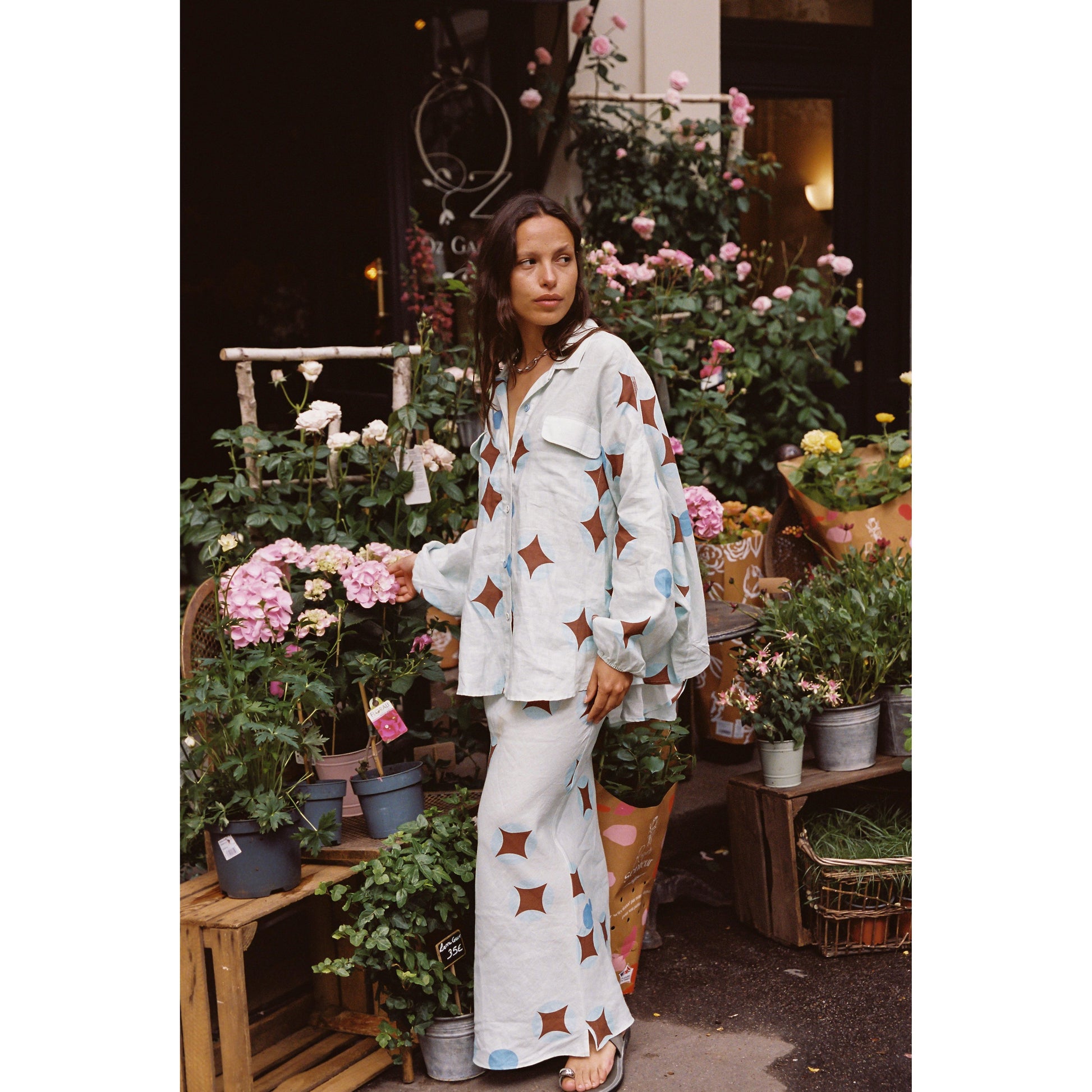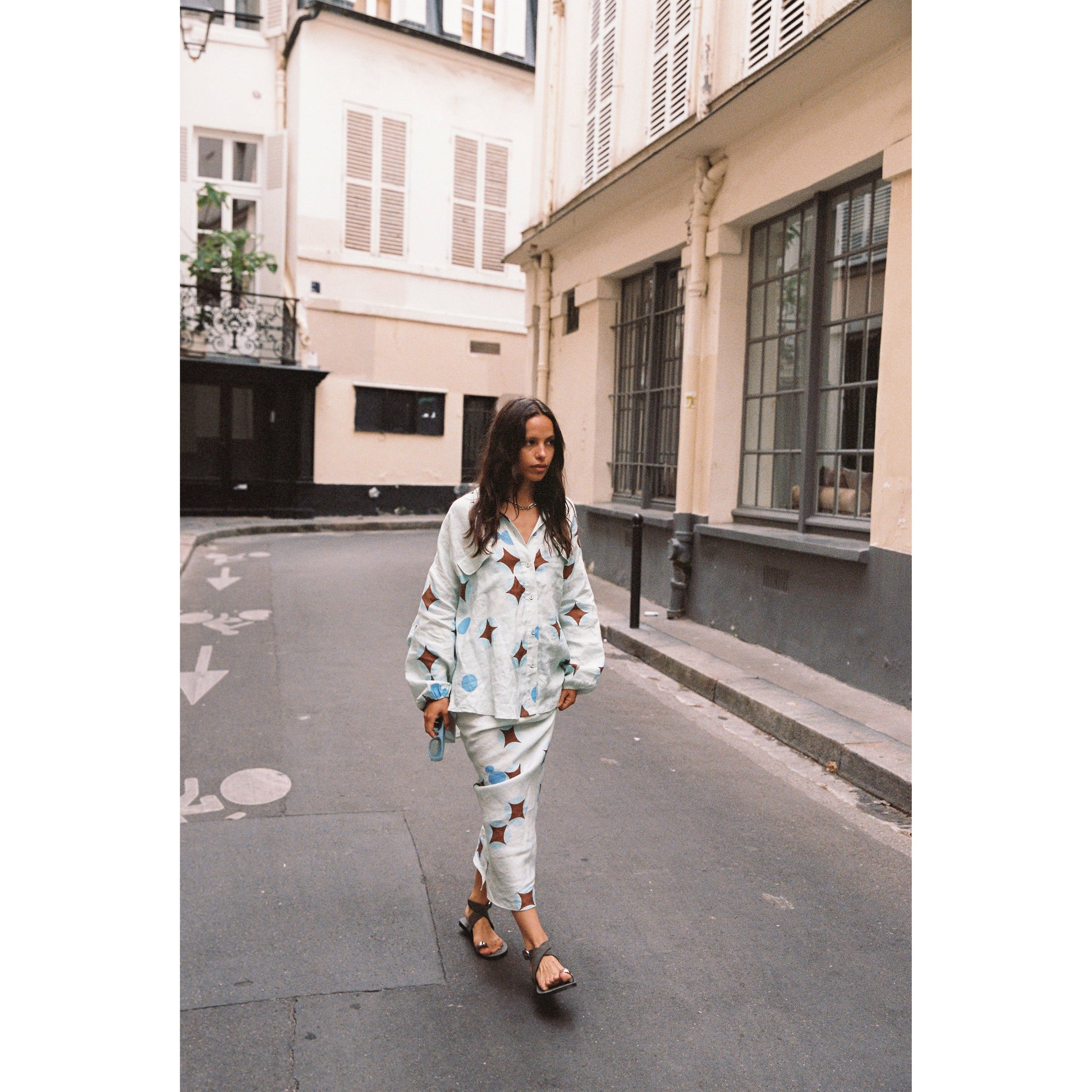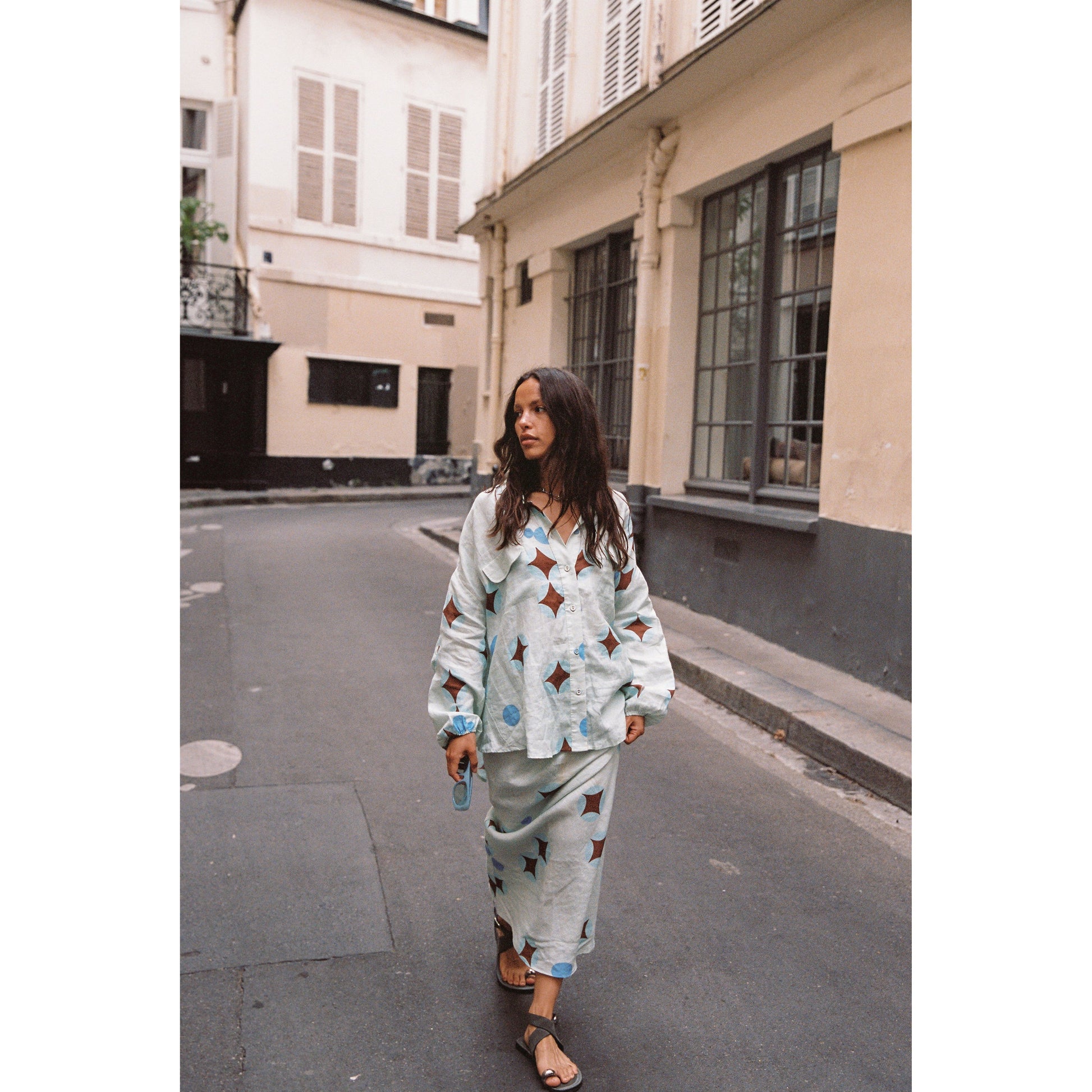 - Dreamy brown celestial print on airy baby blue linen - Flowy column-style pencil skirt, full-length - Elasticated drawstring waist for adjustable fit - Lightweight and breathable fabric - True to size; see sizing guide for details - Made in China, 100% linen
