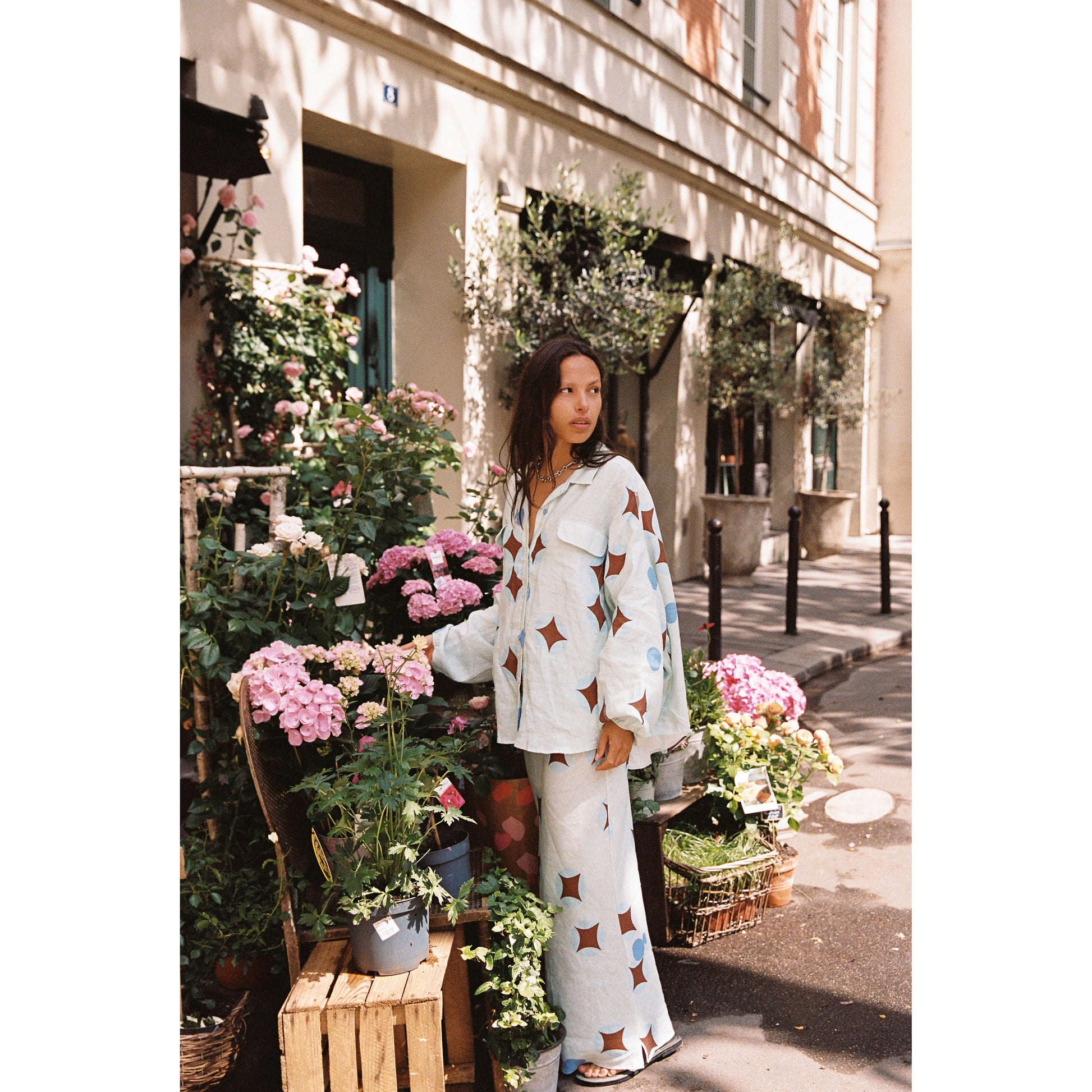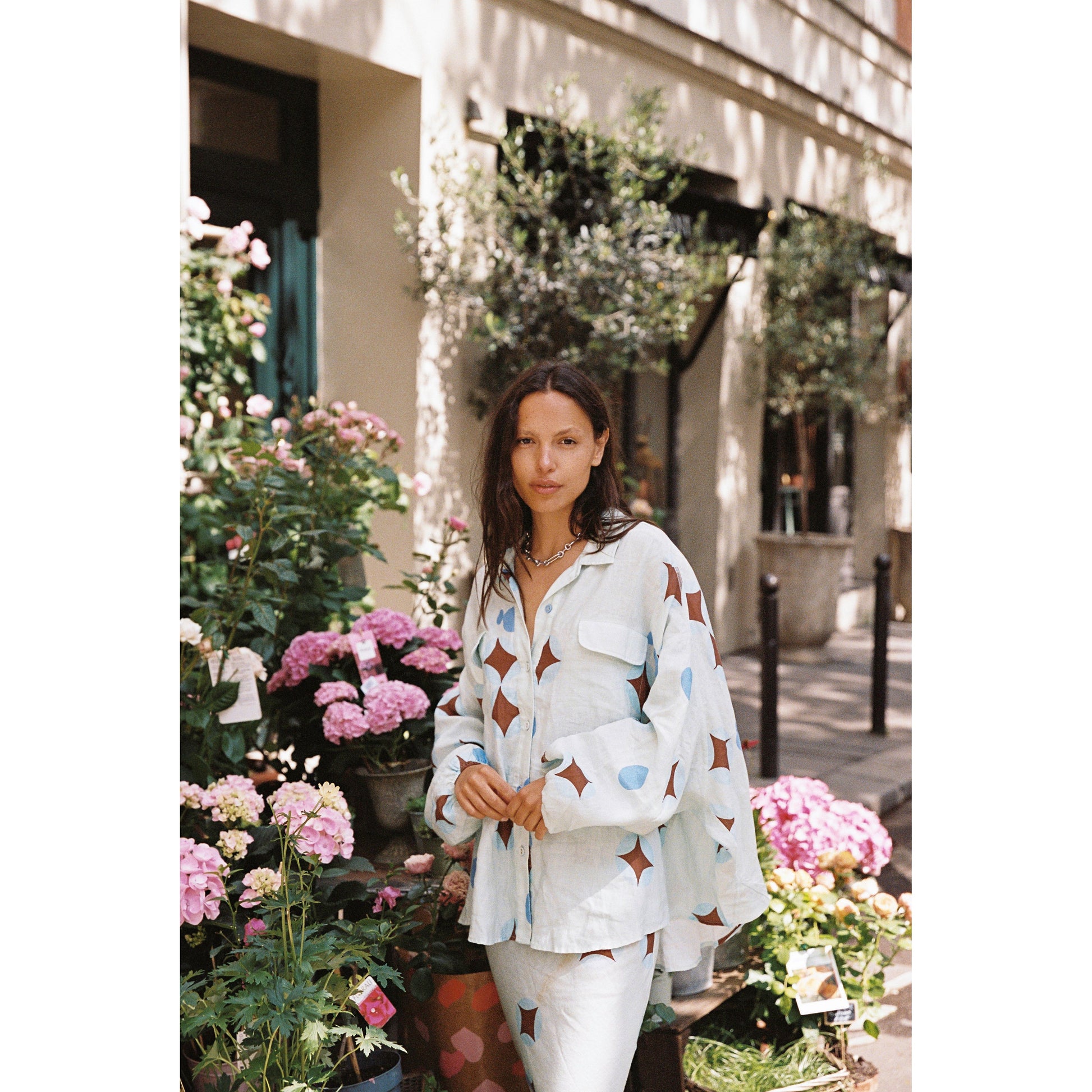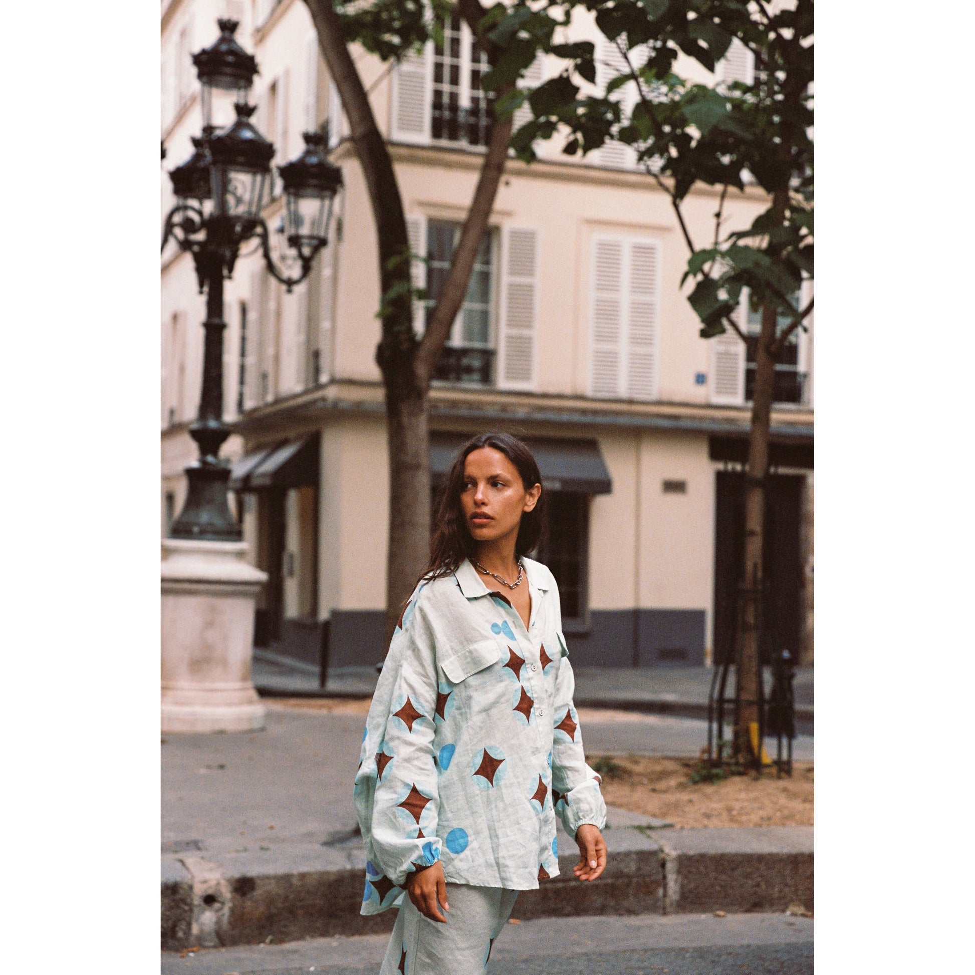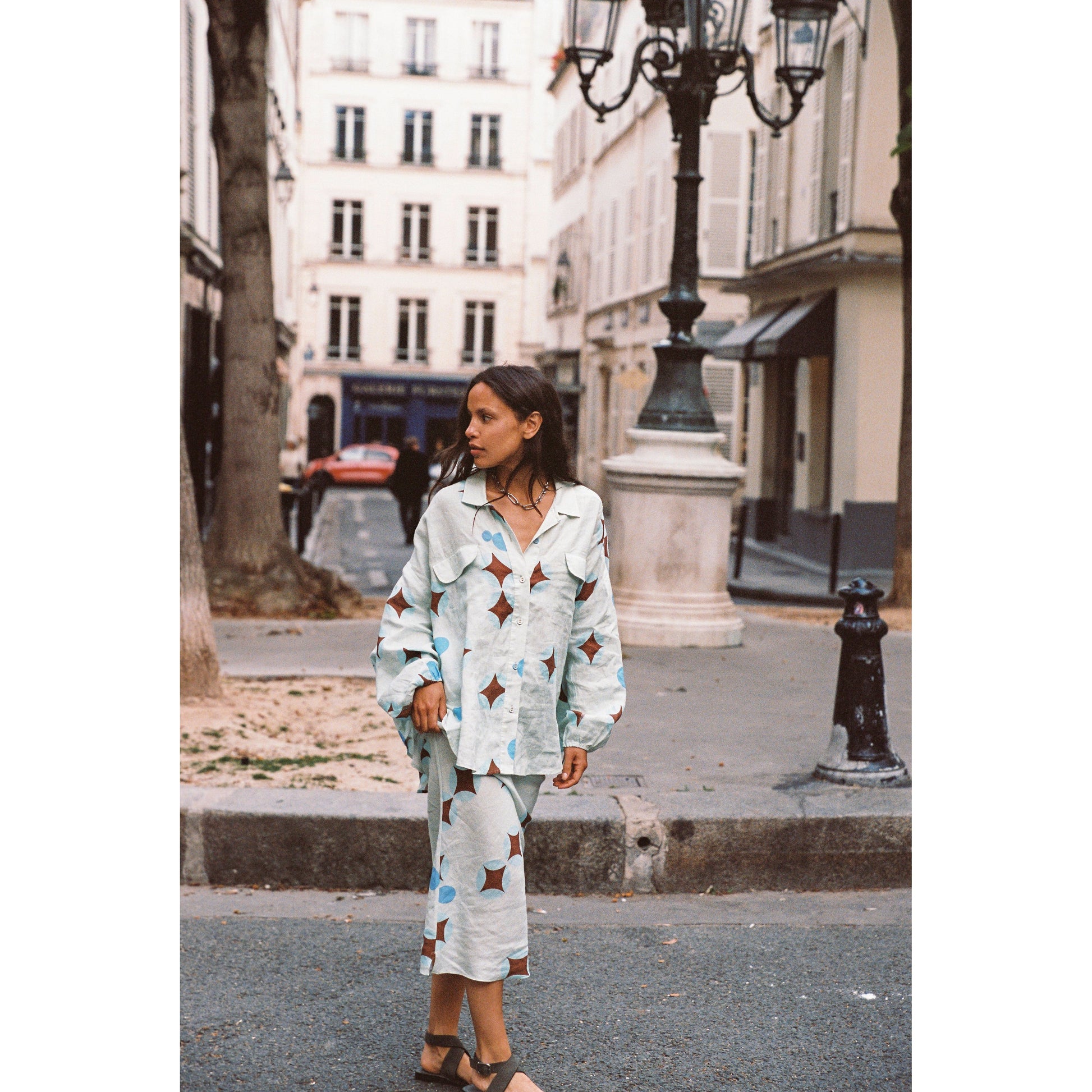 - Dreamy brown celestial print on airy baby blue linen - Flowy column-style pencil skirt, full-length - Elasticated drawstring waist for adjustable fit - Lightweight and breathable fabric - True to size; see sizing guide for details - Made in China, 100% linen