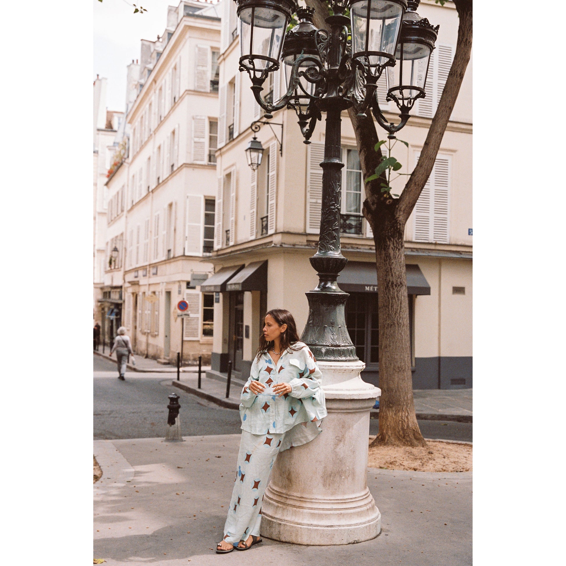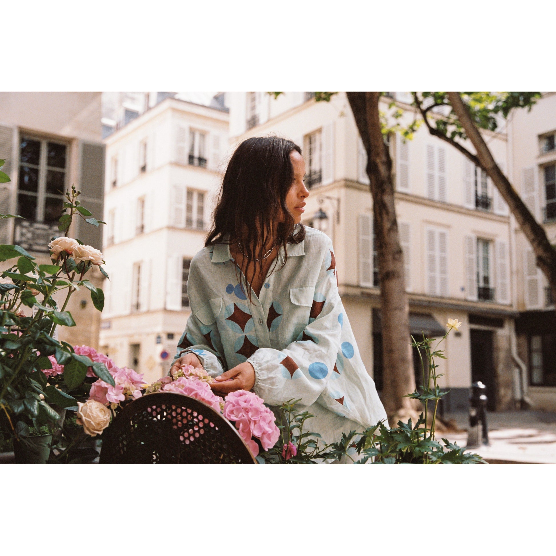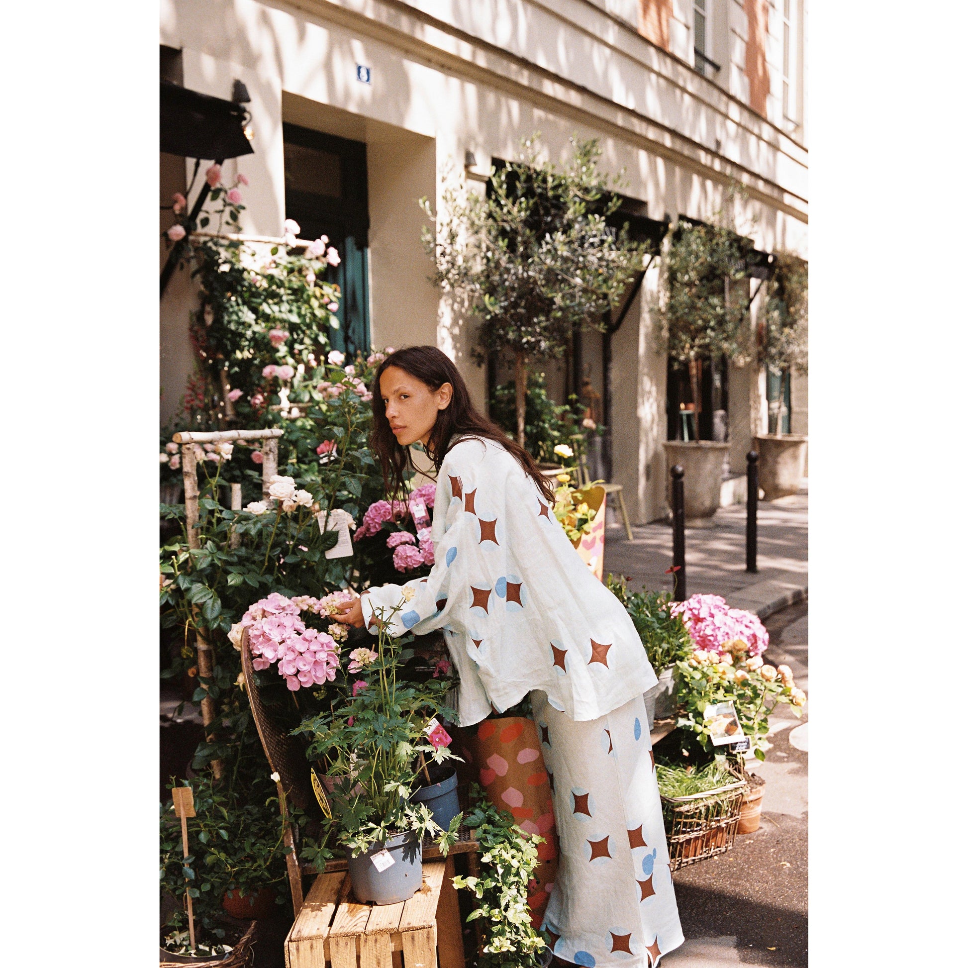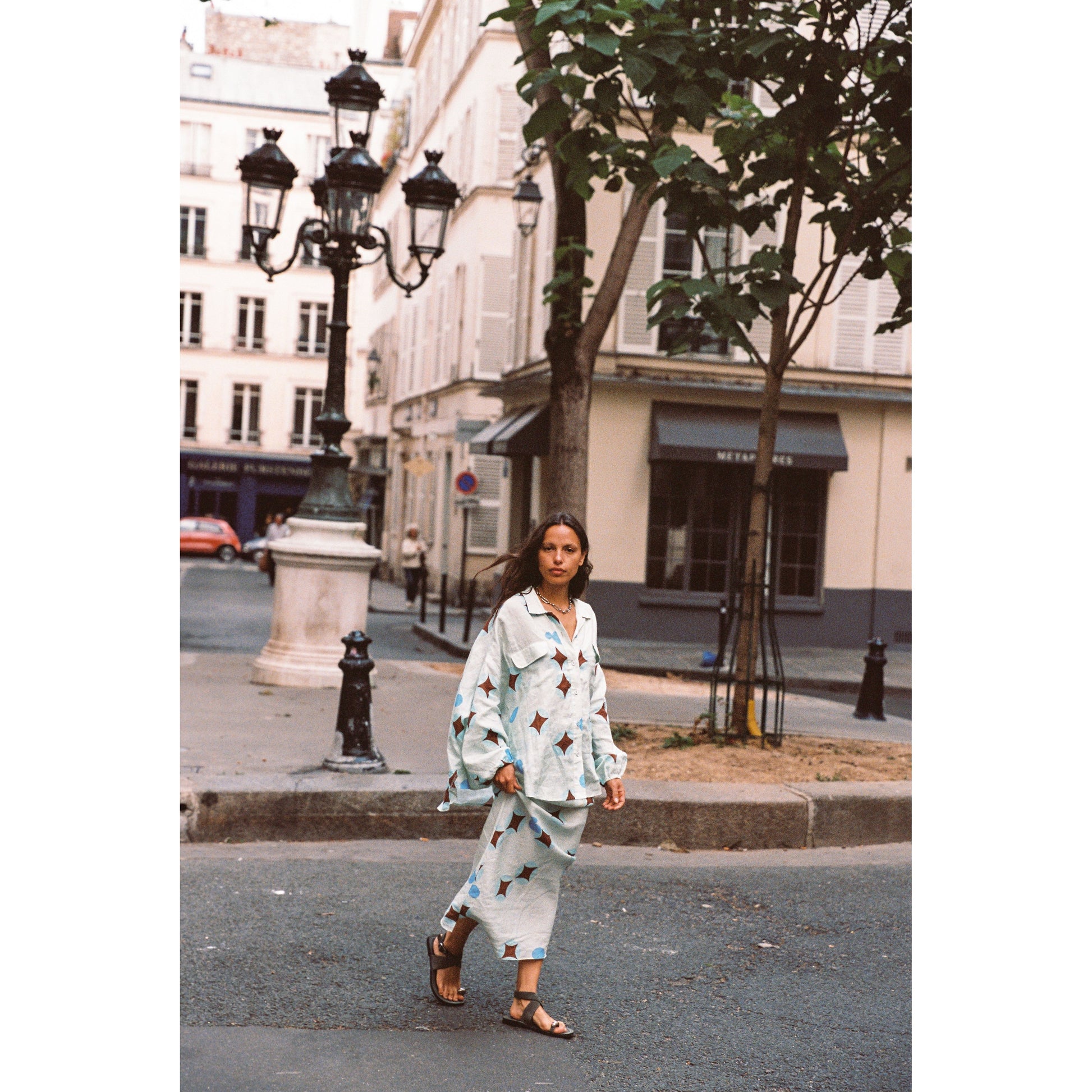 - Dreamy brown celestial print on airy baby blue linen - Flowy column-style pencil skirt, full-length - Elasticated drawstring waist for adjustable fit - Lightweight and breathable fabric - True to size; see sizing guide for details - Made in China, 100% linen