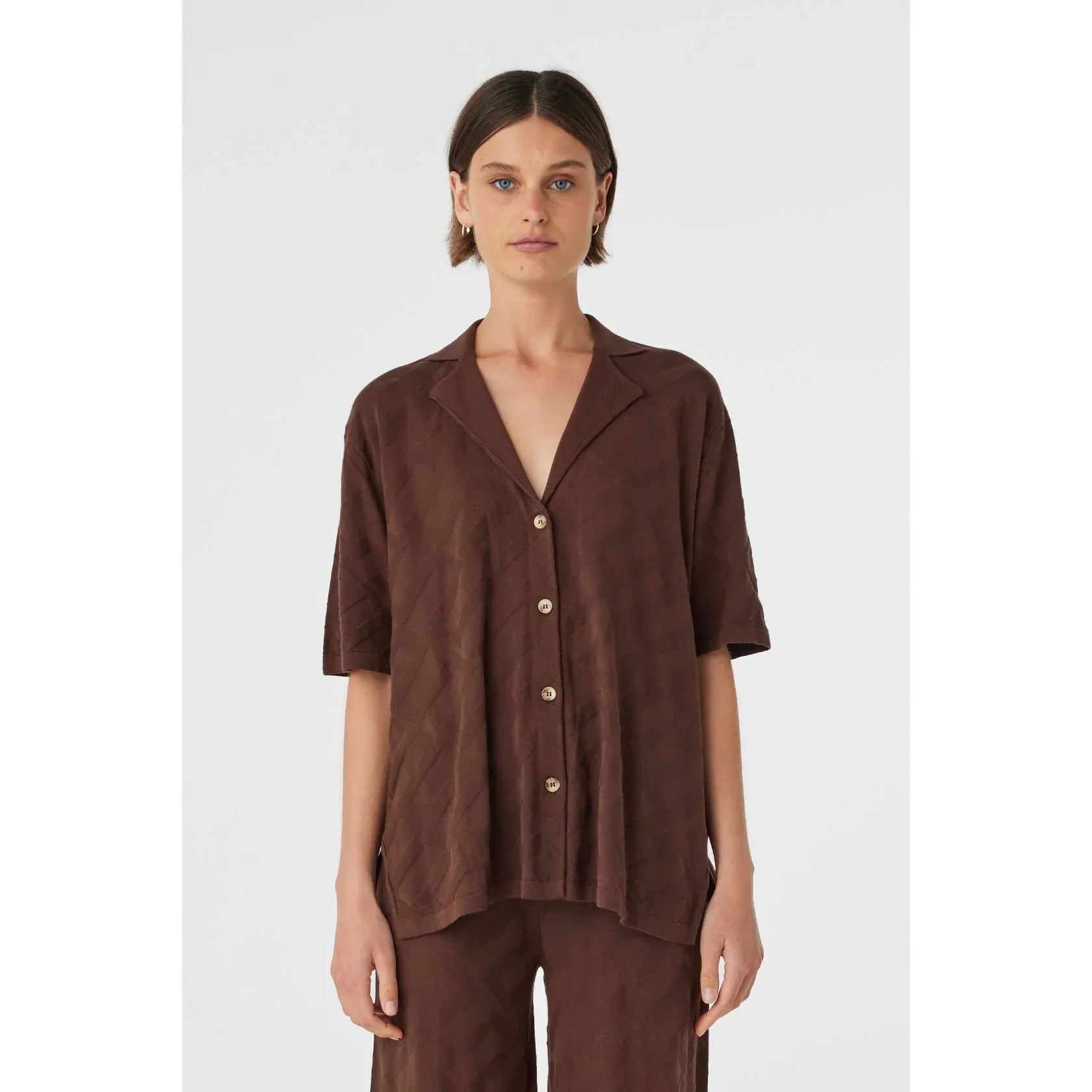 - Oversized button-down knit - Made from 100% organic cotton - Lightweight patterned texture - Open collar with side splits - Relaxed silhouette for easy layering - Breathable and comfortable across seasons