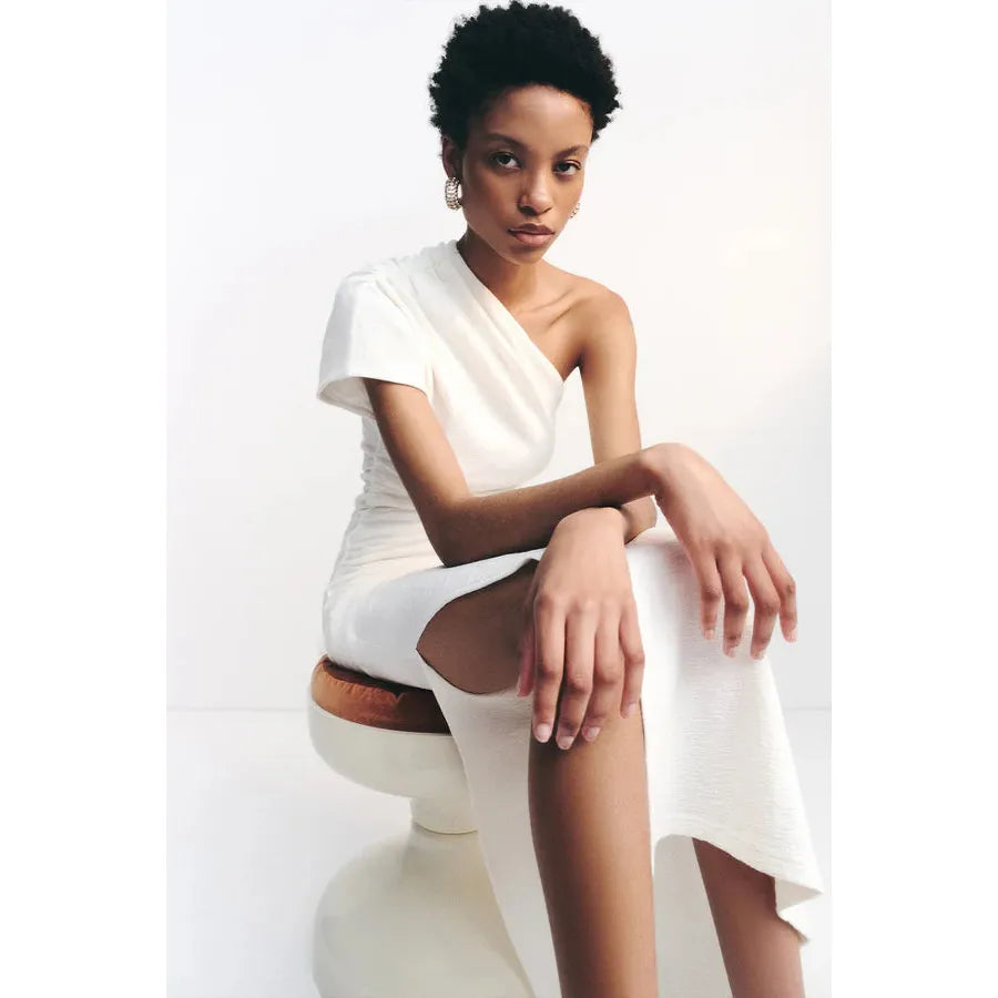 Soft cotton jacquard fabric with a stretchy, medium-weight feel. Features an asymmetrical one-shoulder neckline with gathers at the shoulder and waist. Includes a side split, one-shoulder short sleeve, and a straight midi skirt. Made from 100% Good Earth Cotton and fully lined for comfort.