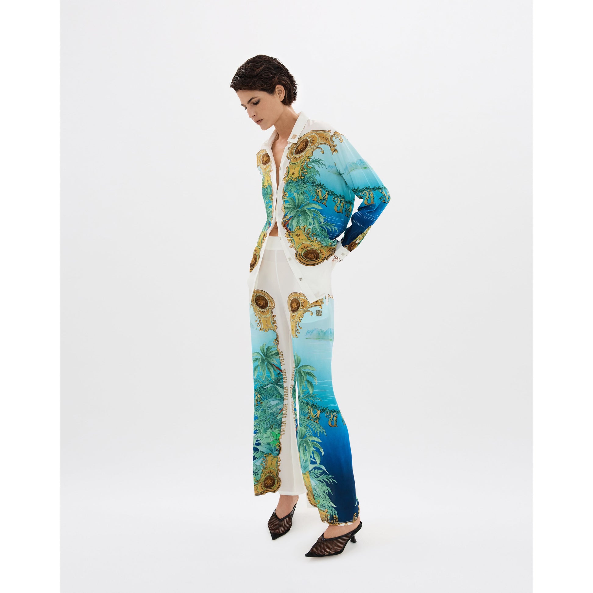 Exuding an opulent & luxurious aesthetic with its vintage, cigar-styled print, we introduce the Blue Cigar Story. Ornate contextual motifs border the waters & tropical greenery of the Vinales Jungle. Set in 100% Organic Certified silk, the soft, luxurious texture drapes elegantly, providing both comfort and style. Featuring a relaxed fit and a custom button-down front, it is a sophisticated statement piece for those who appreciate artful designs with a nod to classic luxury. Intricate geometric embroidery on the cuffs further accents the unique and refined statement, a one-of-a- kind, limited edition piece designed for you to travel & transcend.