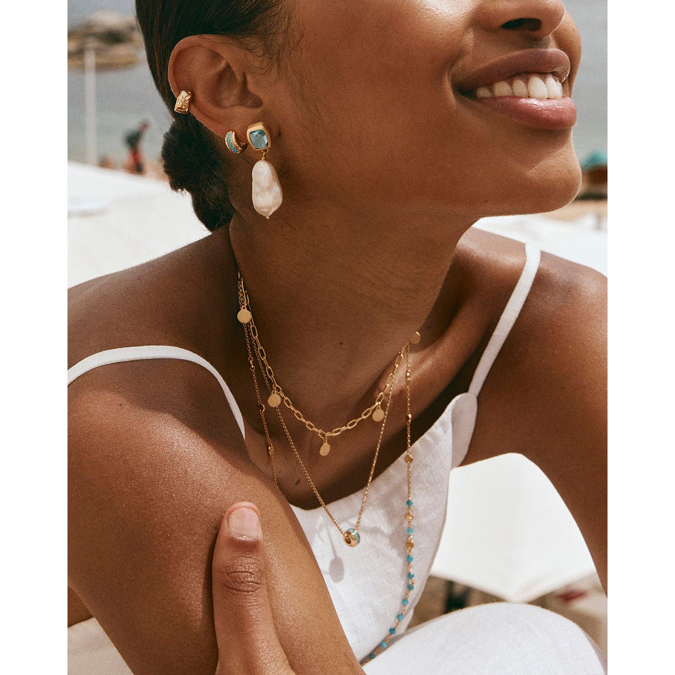 - Gemstones: Blue topaz (5 x 7mm) and freshwater pearl (15 x 20mm) - Metal: Recycled sterling silver with 18k gold plating - Drop length: 45 mm - Finish: Matte - Hypoallergenic and nickel-free