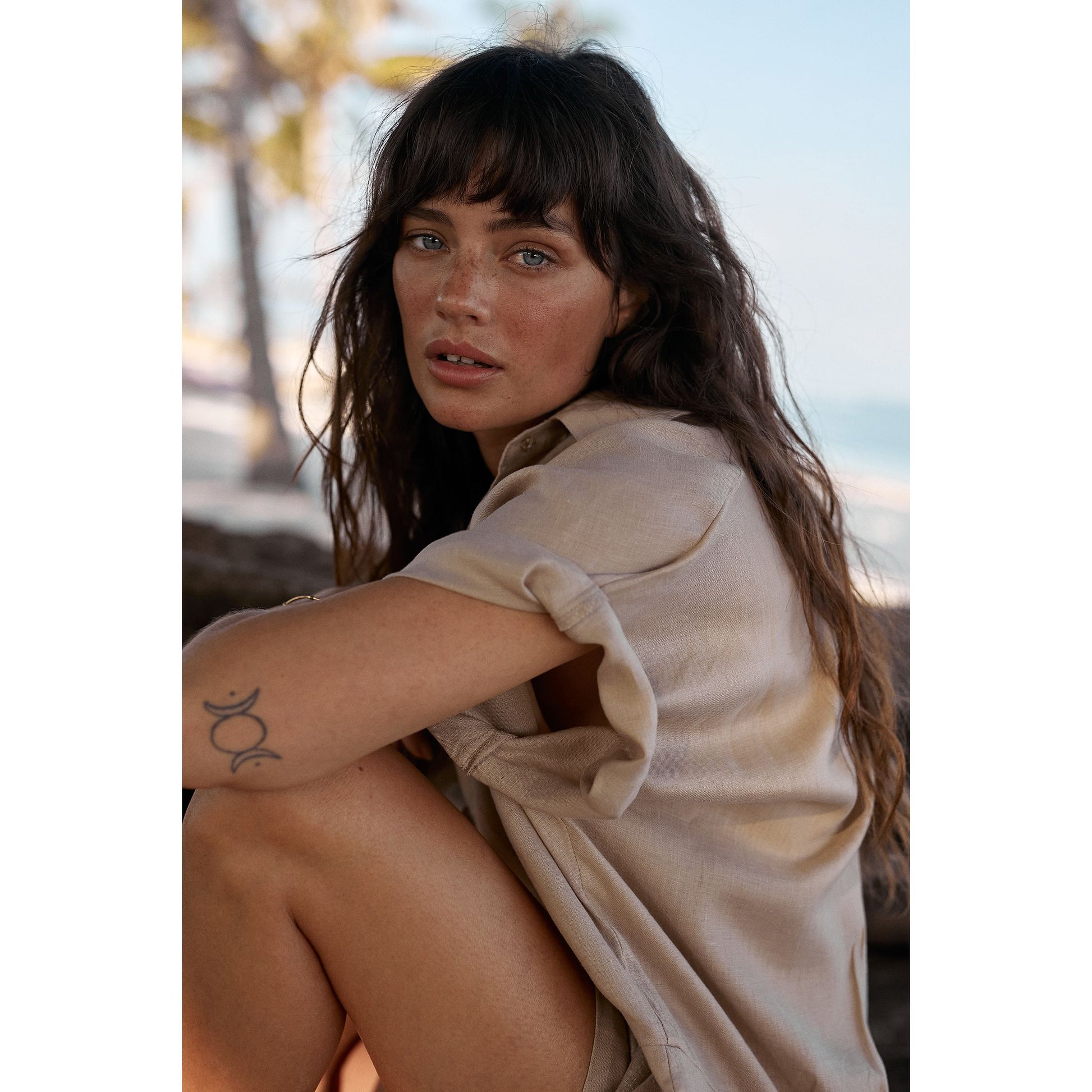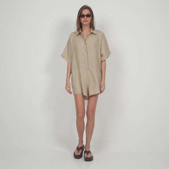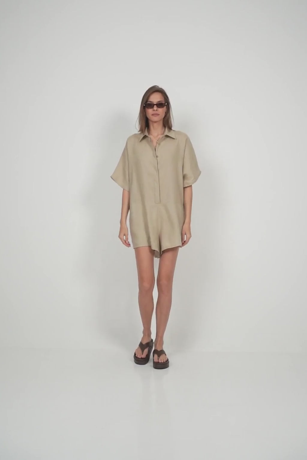 The Del Rio Playsuit in Sand by LILYA is a lightweight linen piece featuring a relaxed fit, button-down front, short sleeves, and mid-thigh length. Its neutral sand color makes it versatile for beach days, weekends, or travel. Comfortable and breathable, this playsuit combines effortless style with everyday ease.