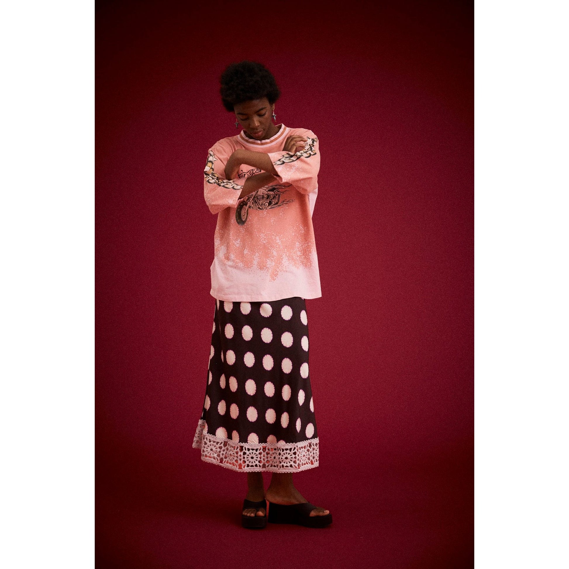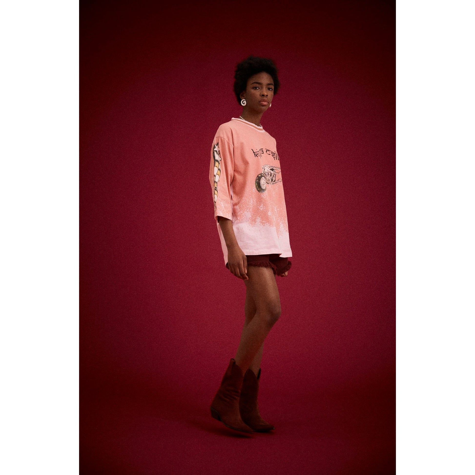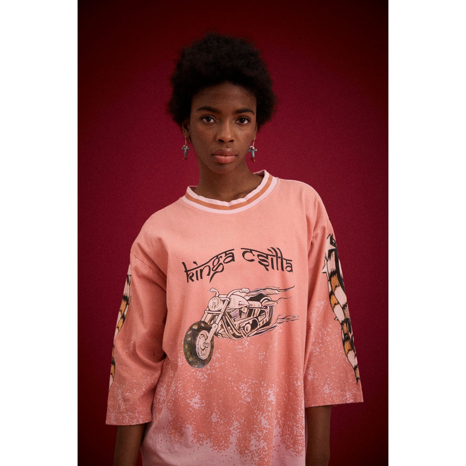 The Desert Racer Tee is back in a stunning desert rose colourway, reimagined from a sold-out classic. Cut in a relaxed, oversized silhouette with wide sleeves, this lightweight cotton jersey drapes effortlessly for an easy, vintage-inspired aesthetic. The signature Kinga Csilla racer graphic adorns the chest, complemented by bold sleeve artwork that adds playful moto energy. A subtle stone wash creates a naturally faded, sun-kissed finish. Perfect paired with denim, shorts, or layered over skirts and lace for an understated statement look.