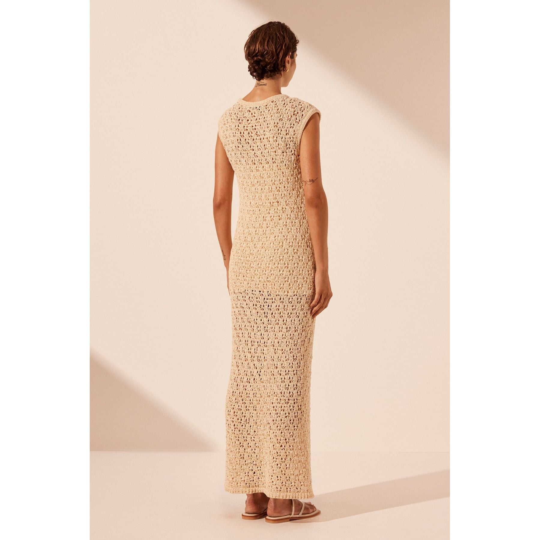 Round neck maxi dress in oat in a semi-sheer cotton crochet.
