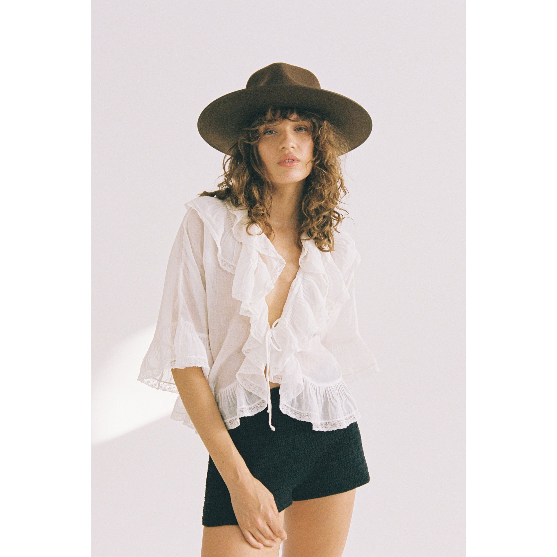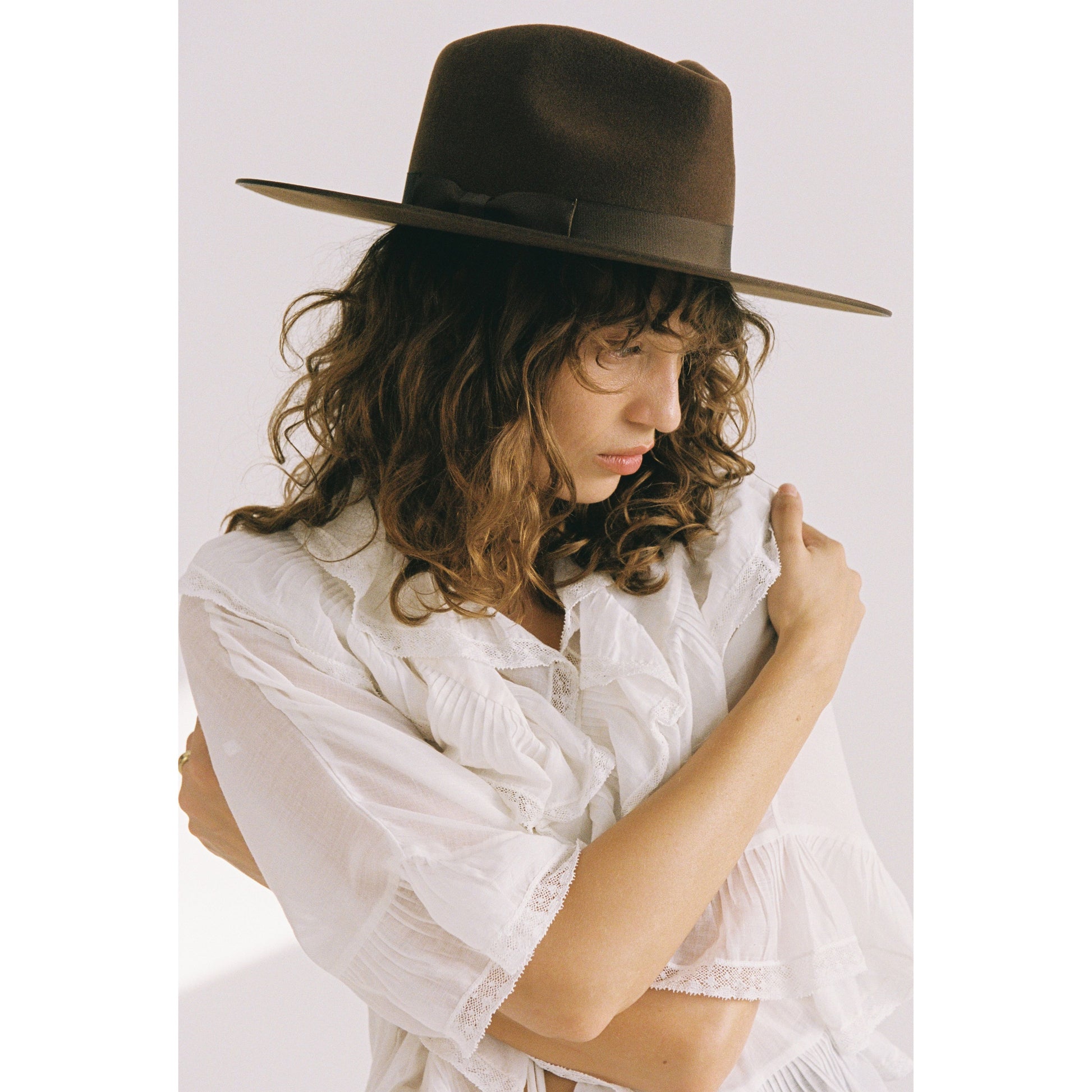 - Wide brim fedora in deep espresso brown - Made from 100% Australian wool felt - Tonal grosgrain edge bind and ribbon bow trim - Brim approx. 10cm (3.95”), crown height 10.5–12cm (4.1–4.7”) - UPF 50+ sun protection, Australian tested