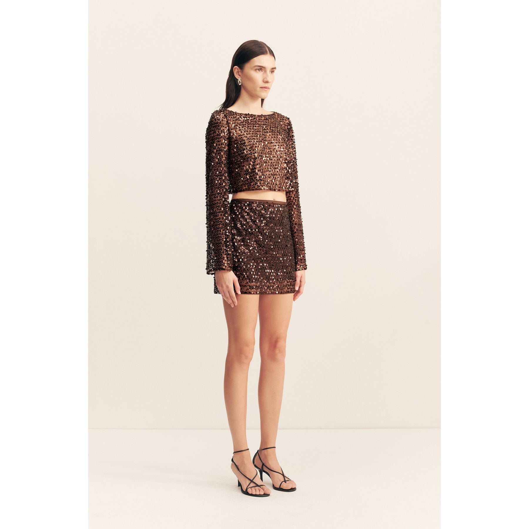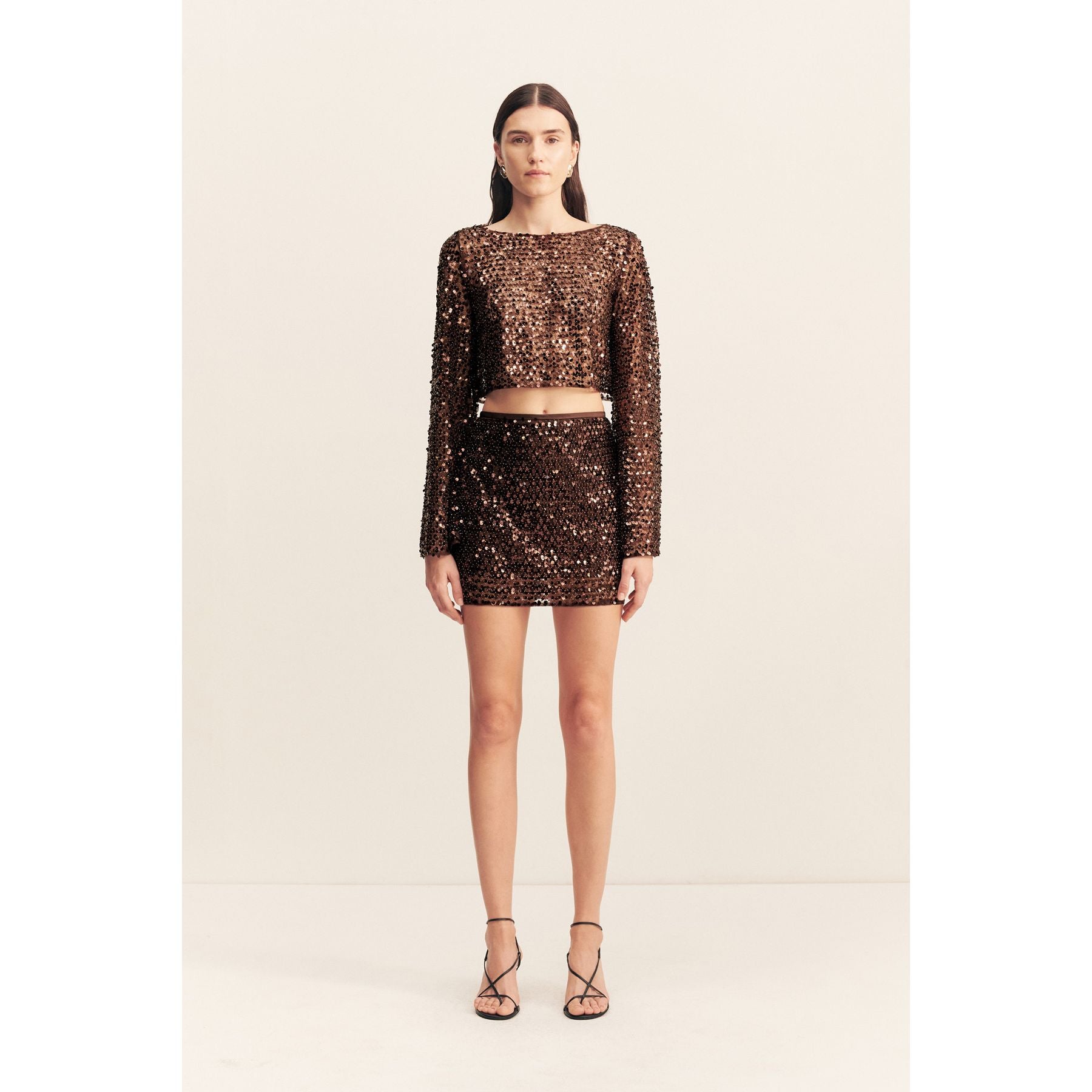 Mid-rise mini skirt crafted from chestnut mesh embellished with sequins and beads. Features a contrast bind waistband, invisible back zip, and a lined interior for comfort. Made from 100% polyester mesh.