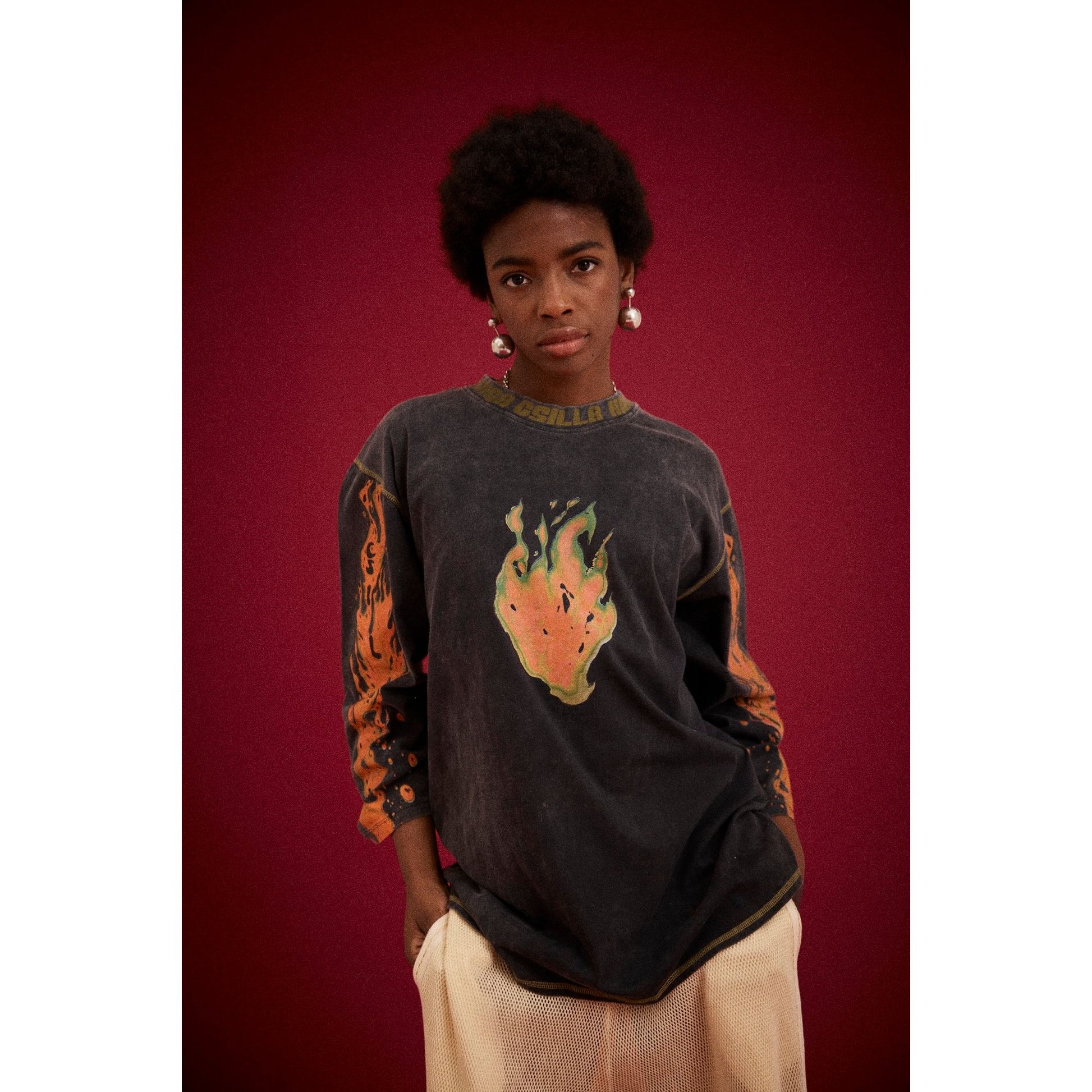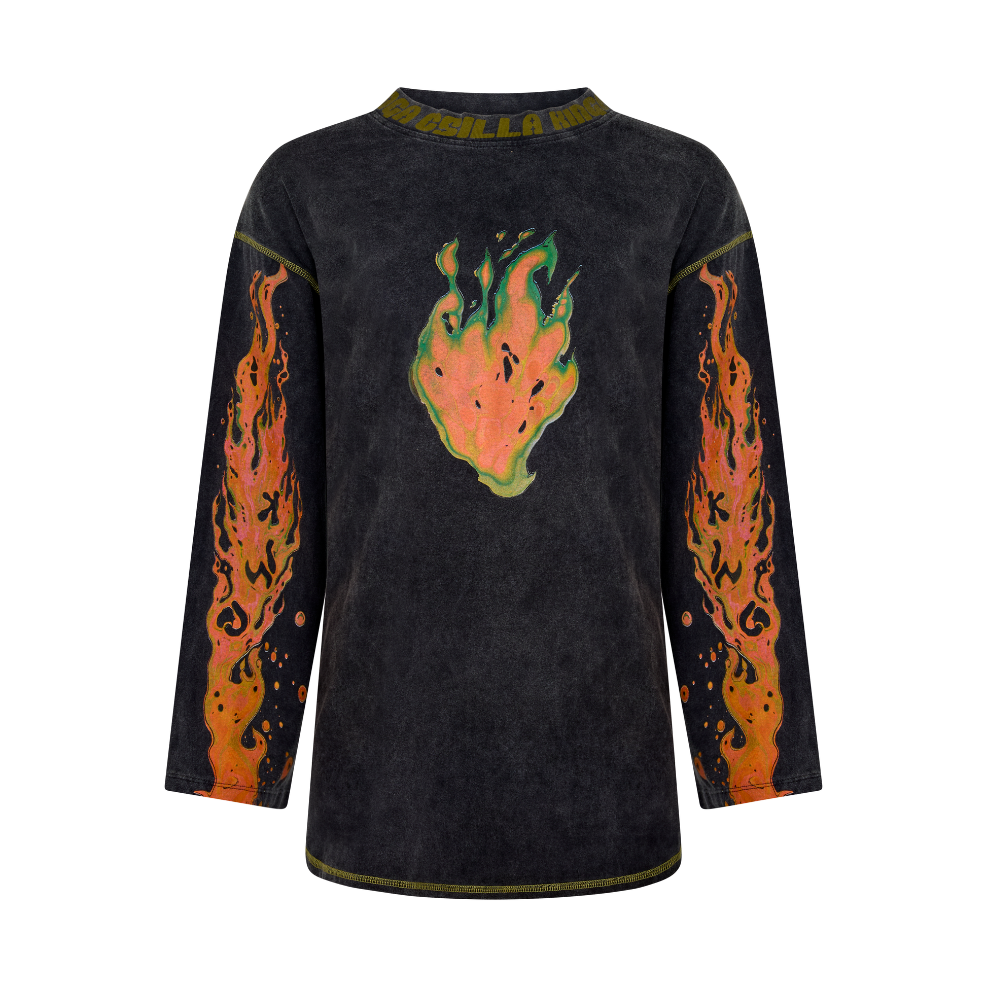 Bold and effortless, the Flaming Heart Tommy Tee delivers vintage edge with modern comfort. This relaxed long-sleeve features a striking flaming heart graphic across the chest and flame detailing on the sleeves, all set against a stone-washed black base with contrast stitching. The worn-in finish feels authentic from day one. Wear it solo for maximum impact or layer it with denim and your favourite KC skort for an instantly cool look.