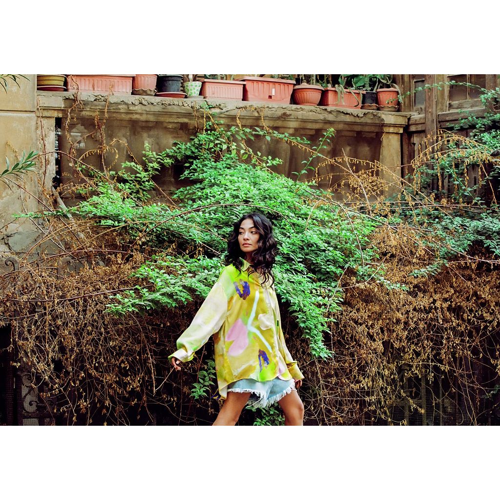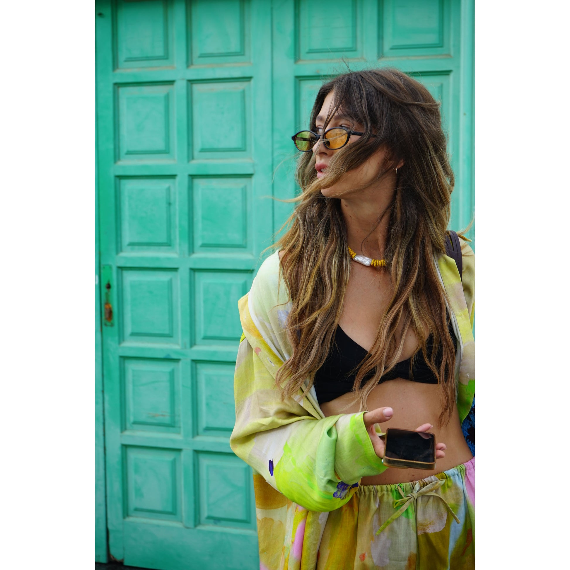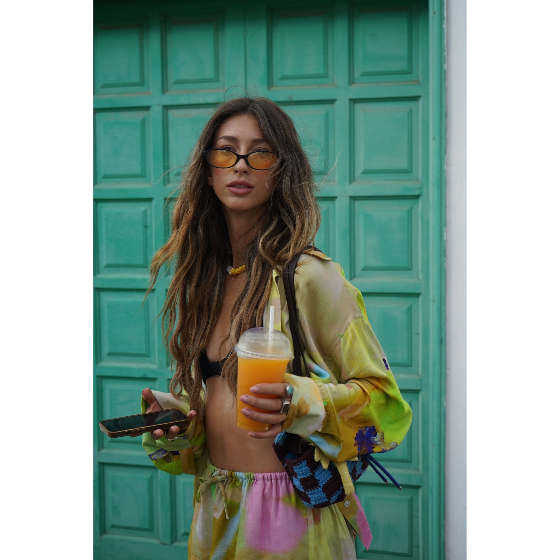 Kate Eliza x Kinga Csilla Echo Dorato Shirt A wearable masterpiece born from artist Kate Eliza's spontaneous brushstrokes, translated into fluid fabric. Awash in luminous citrus, blush, and violet hues, this exclusive collaboration celebrates colour and movement with effortless joy. Crafted from soft, breathable viscose, the oversized silhouette drapes beautifully with a relaxed ease—perfect for creative souls. Button-through front with classic collar. Layer it open over swimwear for sun-drenched summer style, or pair with the matching shorts for a full artful expression.