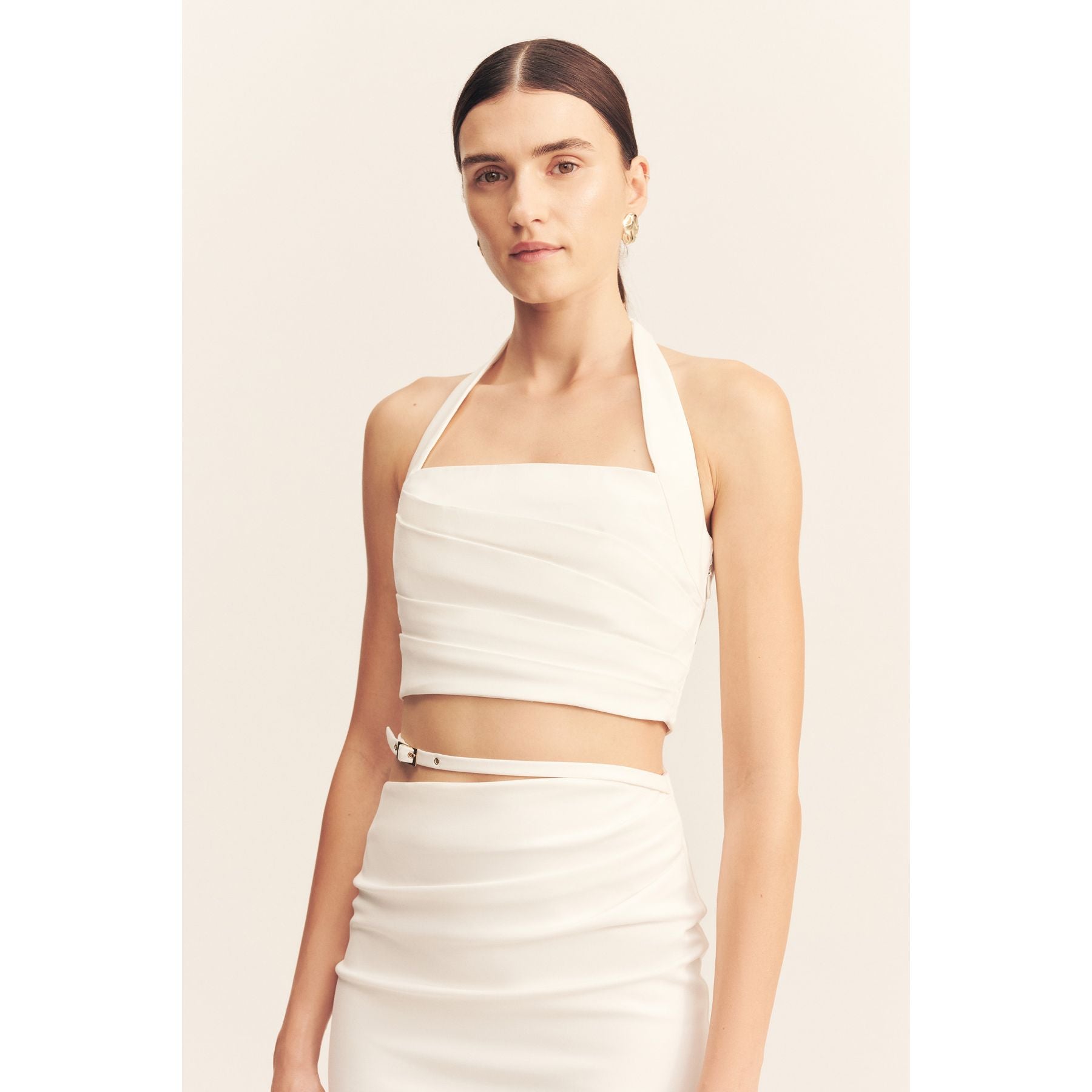 - Premium stretch cotton blend for comfort and flexibility - Halter neckline with elastic at back neck for a secure fit - Draped bodice featuring delicate tucks - Invisible side seam zip for a sleek finish - Medium-weight, stretchy woven fabric - Composition: 50% Cotton, 48% Nylon, 2% Elastane - Fully lined for a smooth feel