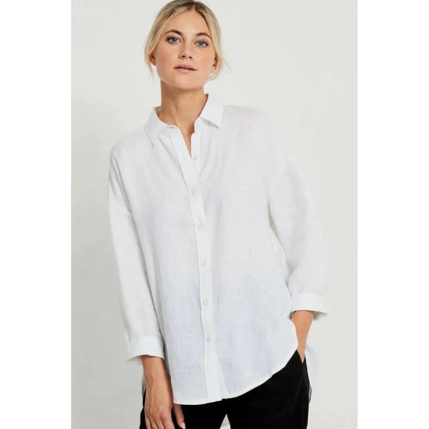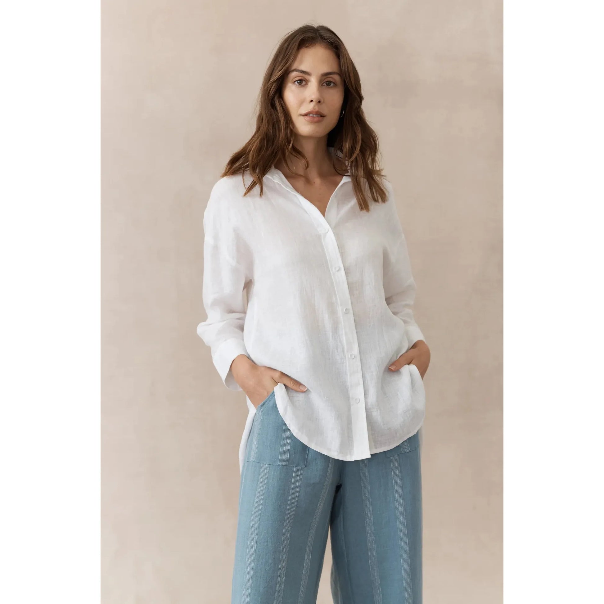 This classic white linen shirt from Little Lies is perfect for everyday wear. It features a relaxed fit for comfort and style, making it a timeless wardrobe staple for any season.