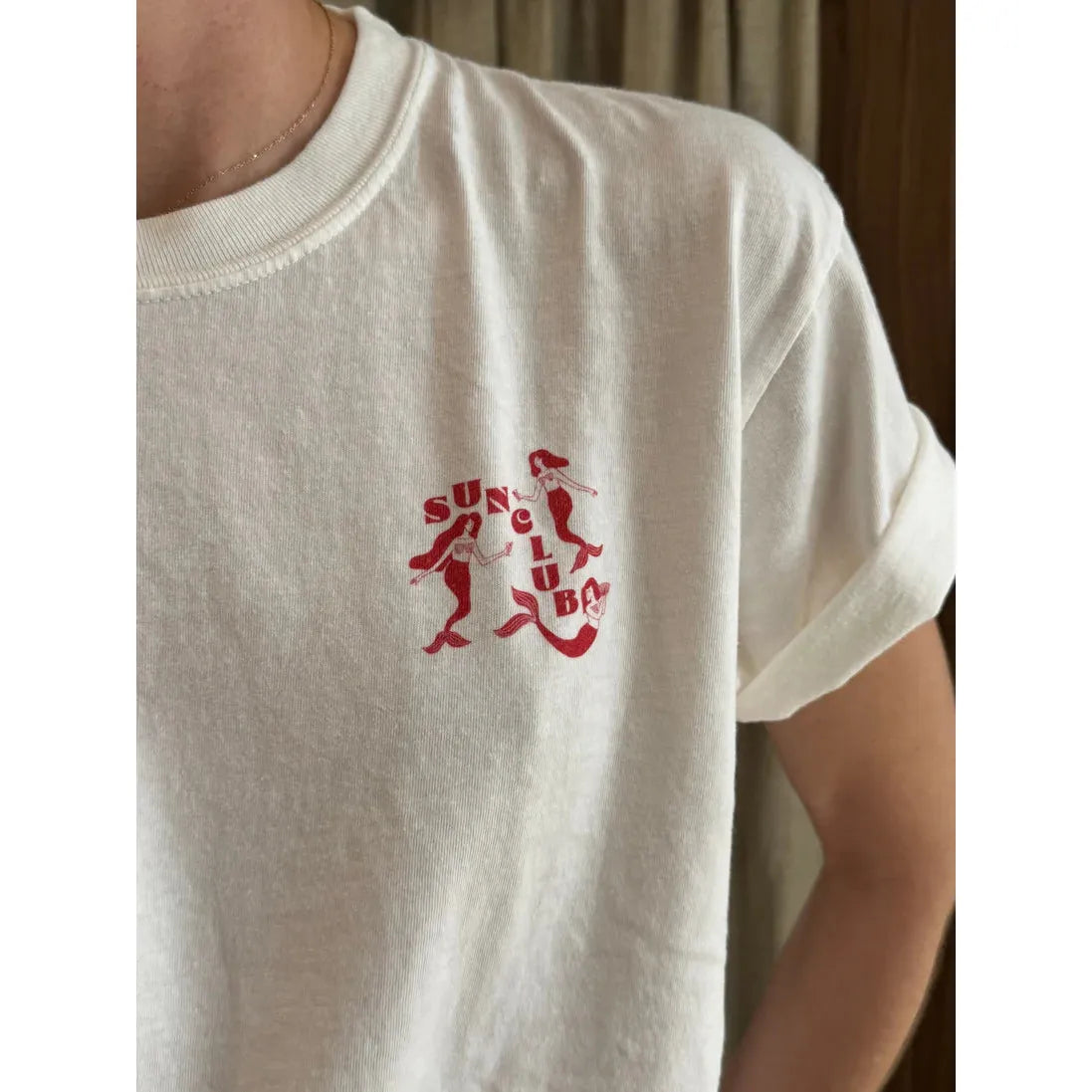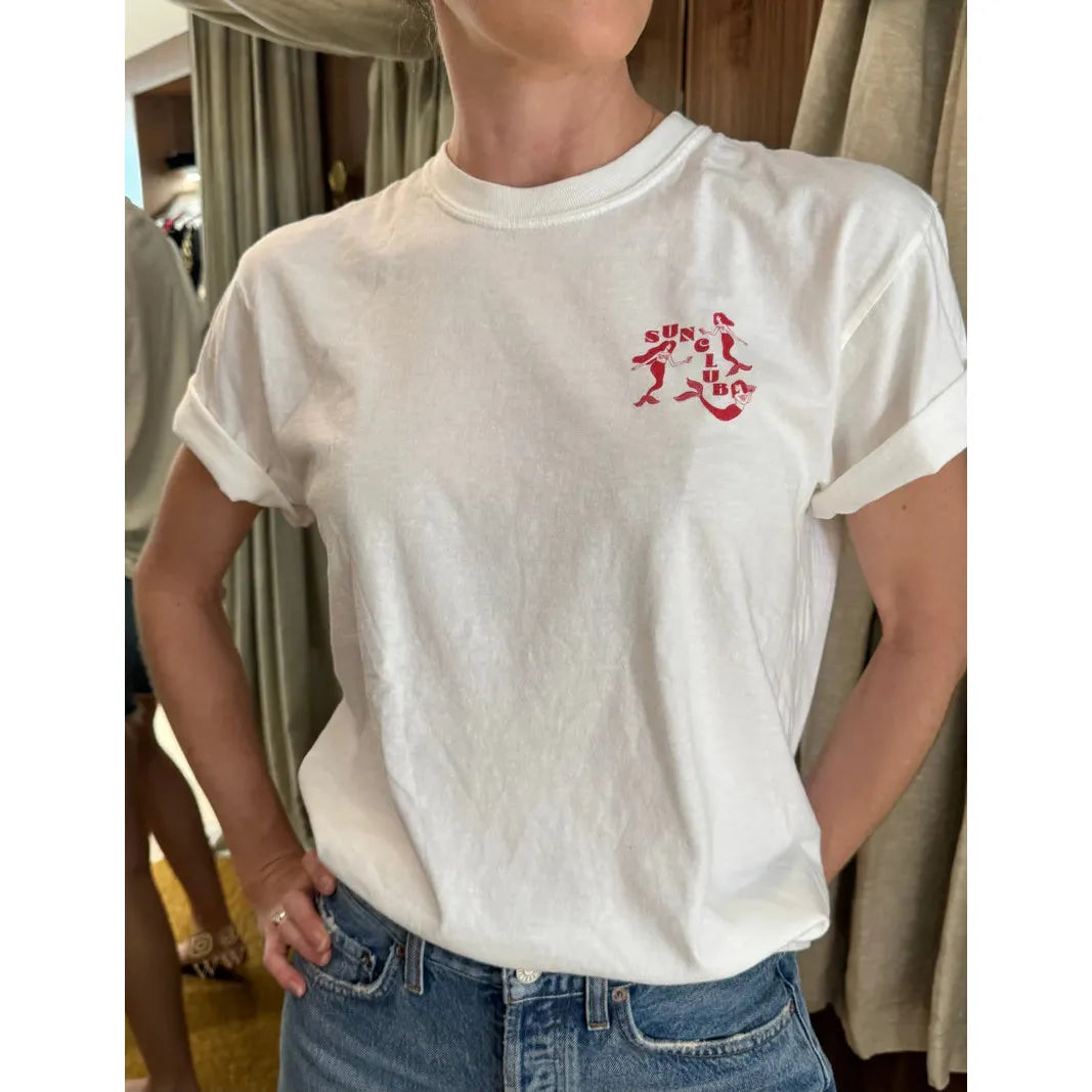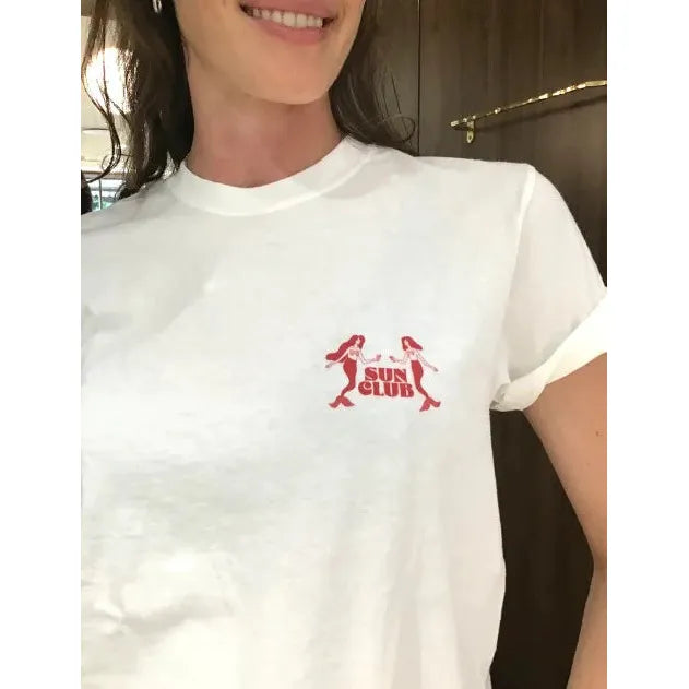 Experience the exclusive Martini Mermaid Tee, featuring a unique Sun Club design created in collaboration with Studio Stina. This unisex, regular-fit tee offers a subtle red print on an off-white fabric, with a small chest detail for understated style. Crafted in Honduras and printed in Australia, it ensures quality and authenticity. Machine washable for easy care, size up to achieve a comfortable oversized look. Perfect for those who appreciate distinctive, expertly designed apparel. Explore the full Sun Club collection to complement your wardrobe.