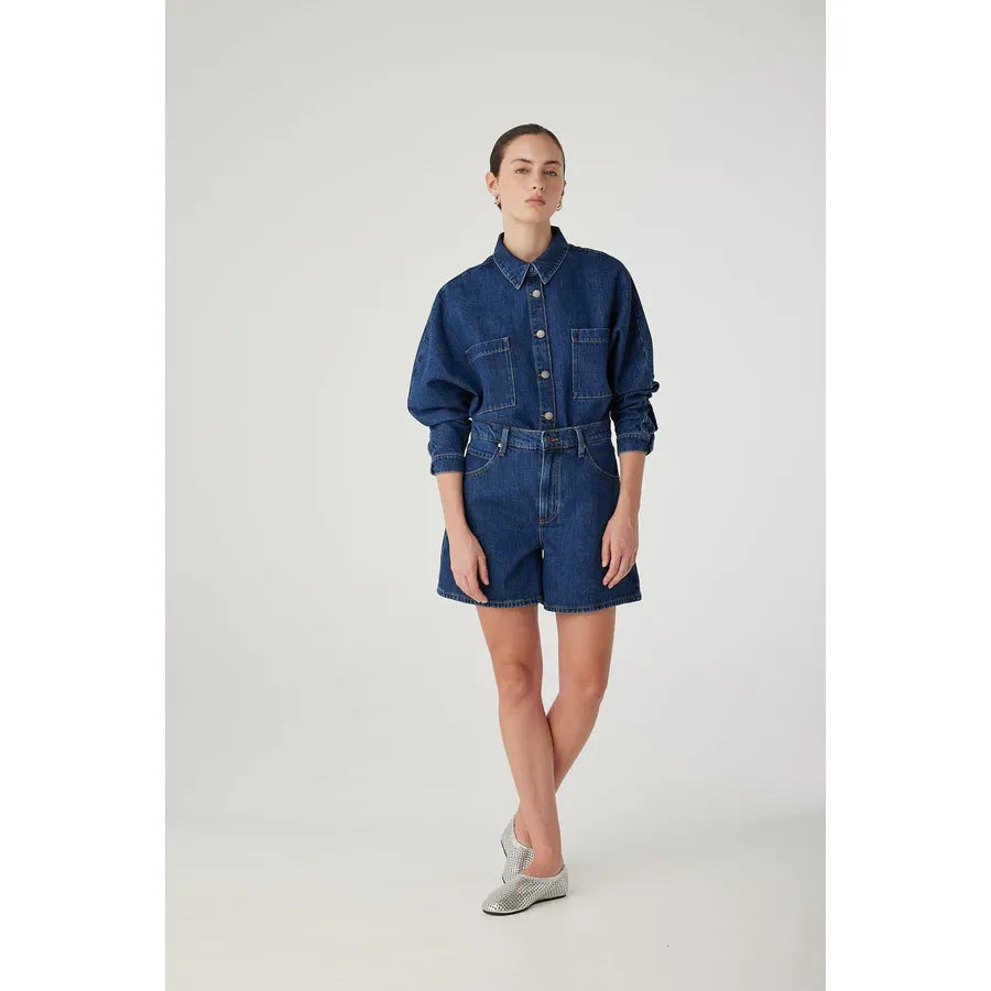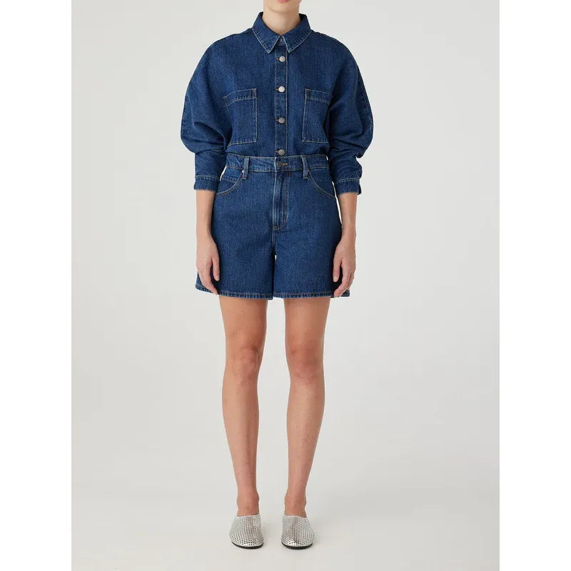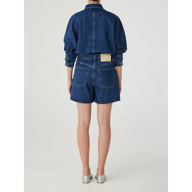 A-Line silhouette 12.5" high rise 5" mid-thigh length Rigid denim fabric