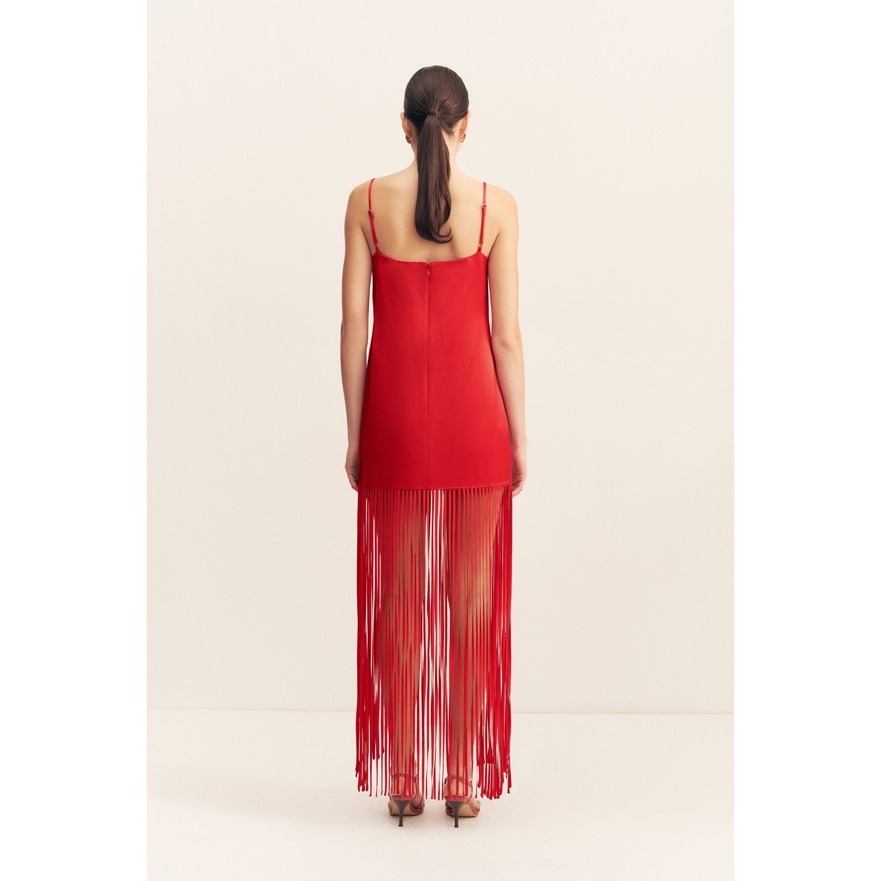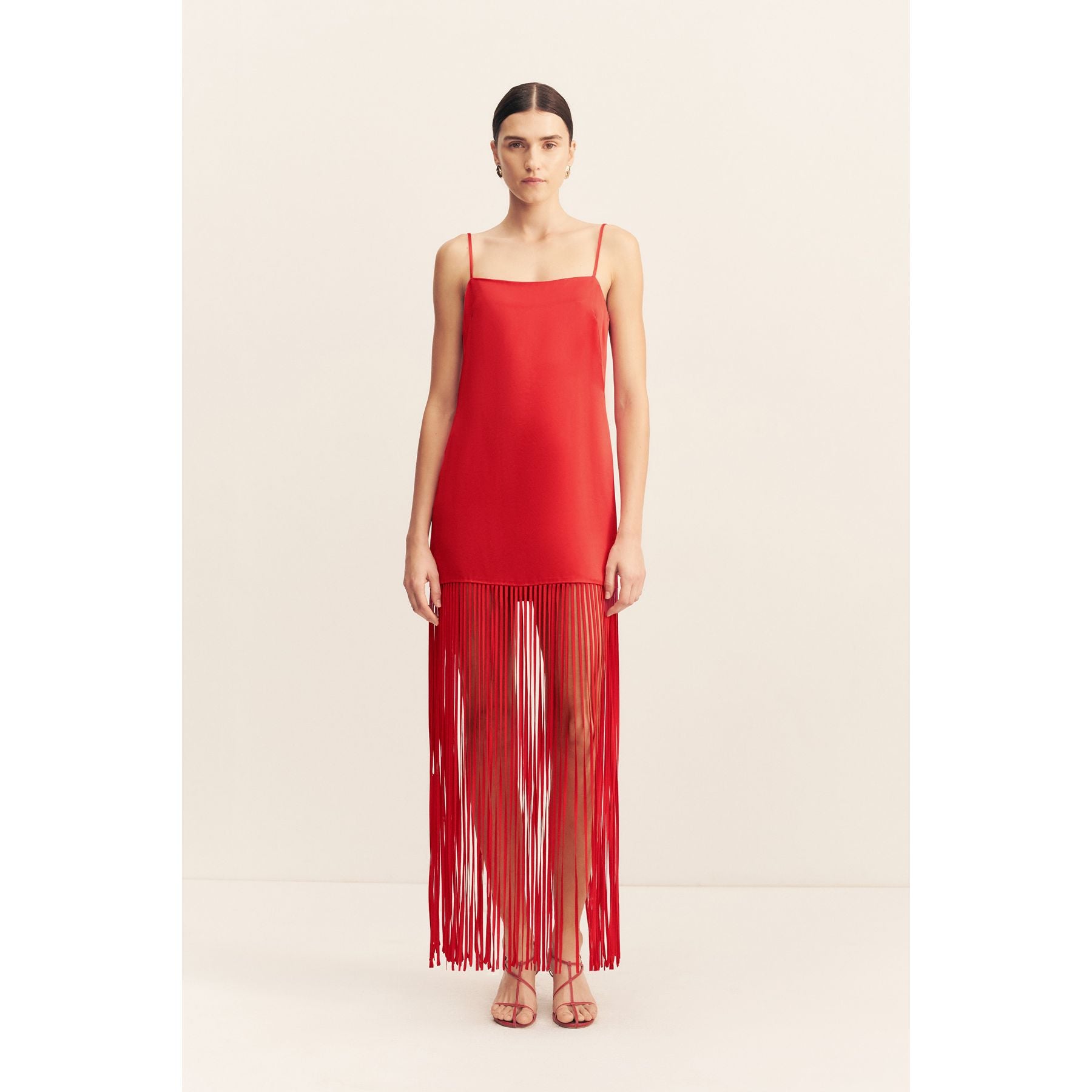 Moraya Square Neck Fringe Maxi Dress features a luxurious satin acetate bodice with adjustable rouleau straps and a square neckline. It has a dropped waistline and a contrast flat bind fringed maxi skirt made from semi-sheer viscose georgette. The dress is loose fitting with an invisible back zip and a mini-length lining. Crafted from 55% acetate, 45% polyester, and 100% viscose, it offers a medium-weight, non-stretch woven feel in a vibrant chilli color.
