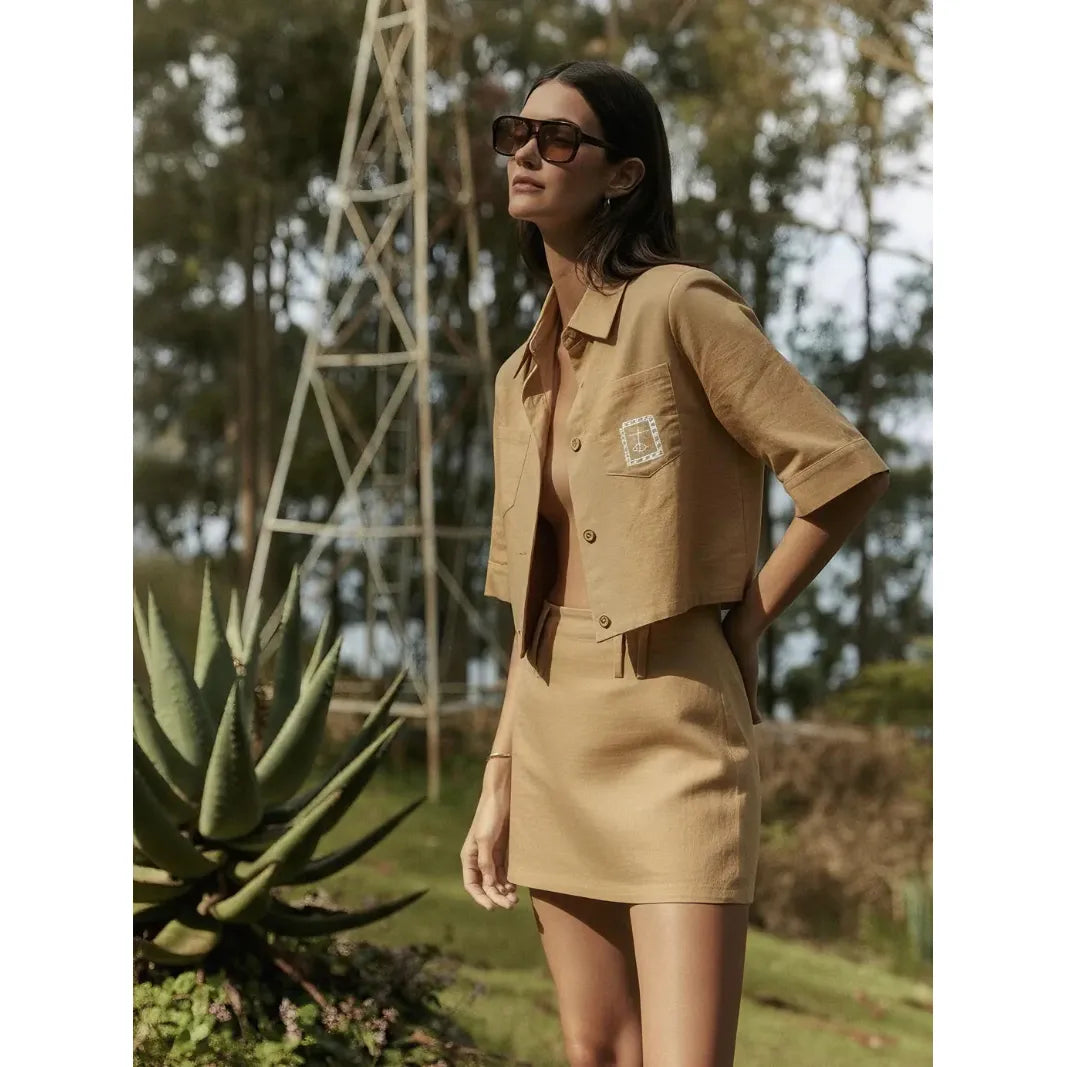 Nacida Skirt in Tan Lightweight 55% cotton, 45% linen blend for breathable comfort. Warm tan colour suits any season. Relaxed A-line silhouette flatters effortlessly. Invisible front pockets keep essentials close. Double belt loops for styling flexibility. Pairs beautifully with the Nacida Shirt for coordinated elegance, or layer with the Tia Tank or Rosa Ribbed Tank for casual sophistication. Beach to brunch to evening—this versatile essential adapts to every moment.