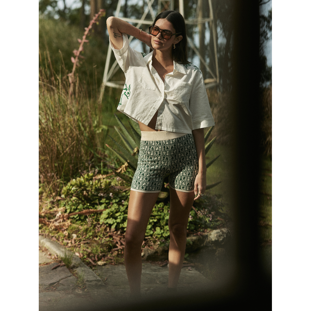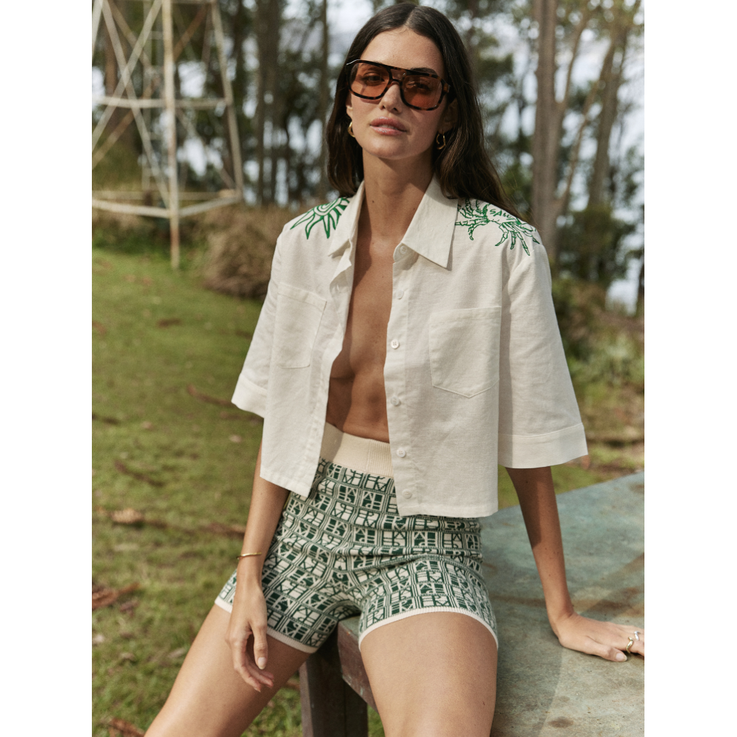 Nacida Top in White with Green Embroidery Effortless coastal elegance meets everyday comfort. This relaxed, oversized crop top features a breathable cotton/linen blend that's soft and perfectly weighted for warm weather. The crisp white base is elevated by intricate green embroidery—artisan detail that transforms a simple top into a statement piece. Pairs beautifully with high-waisted bottoms for a flattering, modern silhouette.