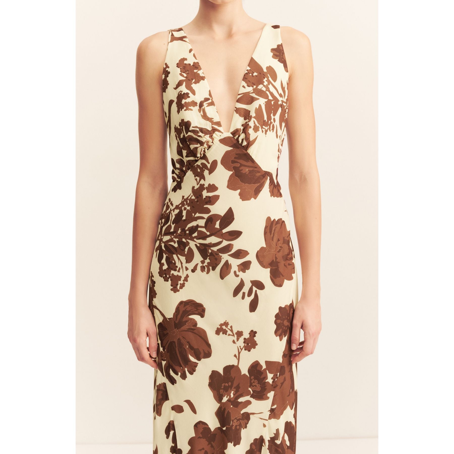 The Noa Plunged Maxi Dress combines effortless elegance with contemporary design. Crafted from lightweight viscose georgette, this semi-sheer piece features a striking floral pineapple wallflower print that makes a sophisticated statement. The plunged neckline and gathered underbust create flattering definition, while the open back with centre tie adds an unexpected touch of allure. A bias-cut maxi skirt ensures graceful movement, and the invisible centre back zip provides seamless styling. Fully lined for comfort and confidence. Available in Pineapple Wallflower and Vista Blue.