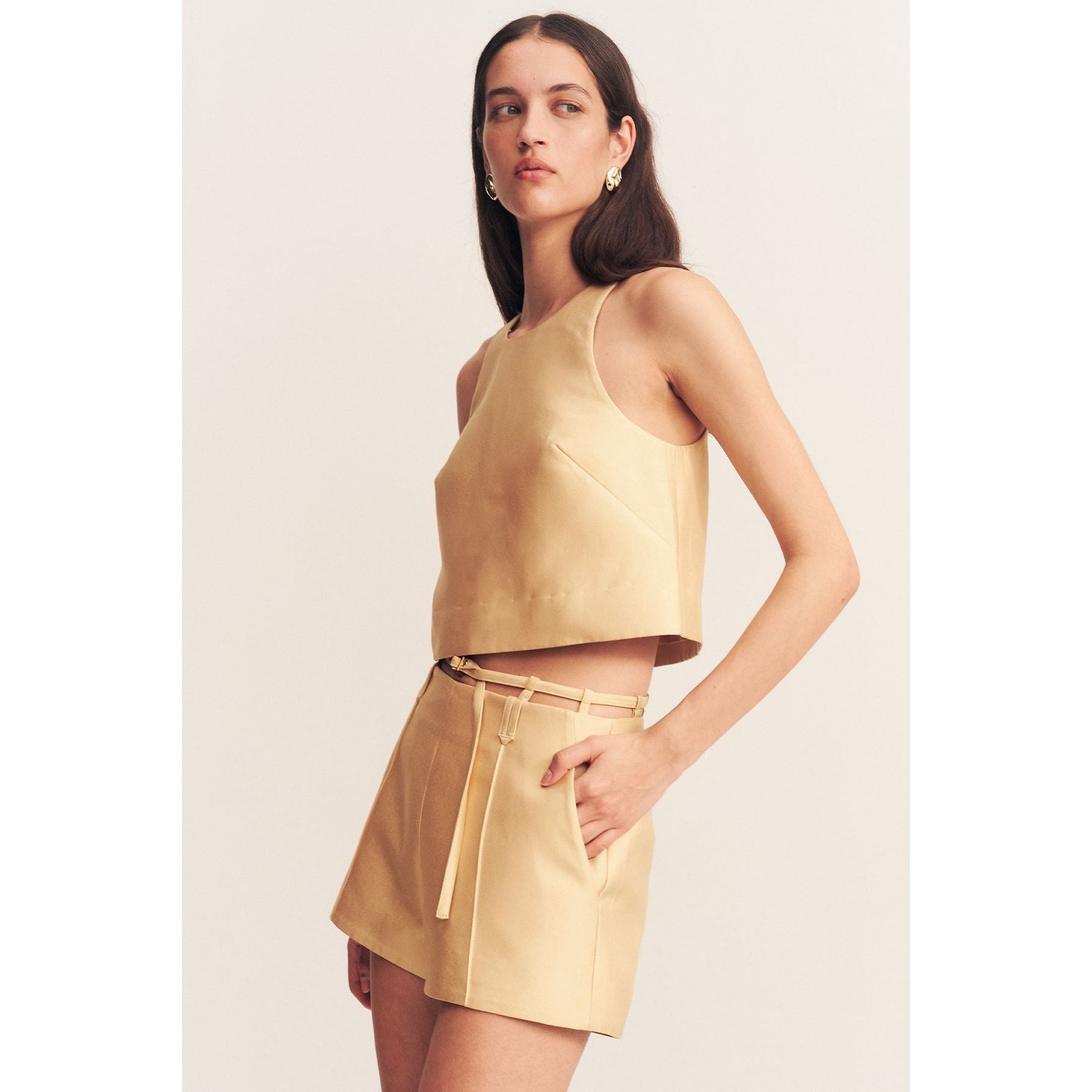 Micro short with pin tuck detail in caramel in a luxurious cotton sateen blend.