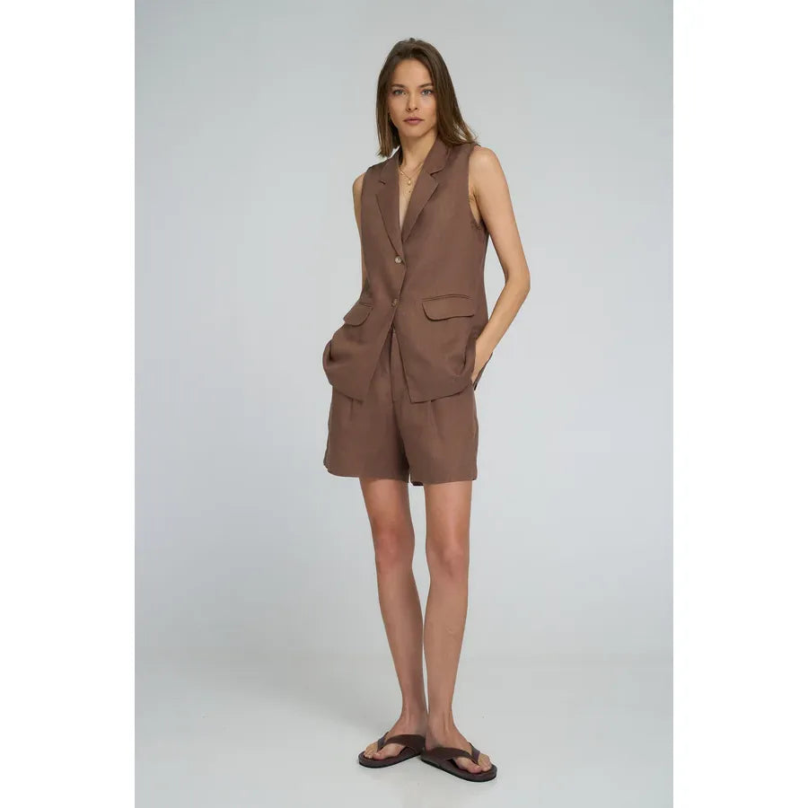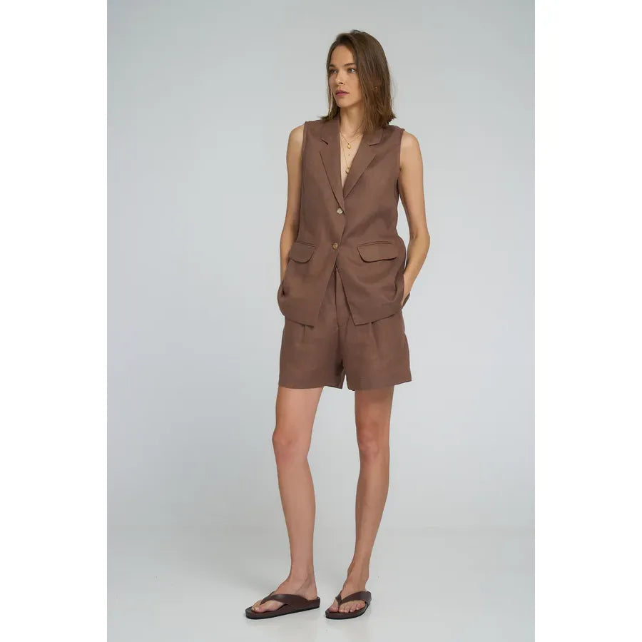The Pyramide Short in rich chocolate linen offers a relaxed fit with flattering front pleats and a longer length. Features include a zip and button closure, side pockets, and simple tailored lines. Perfect for casual or polished looks, pair with loose shirts or tucked knits.