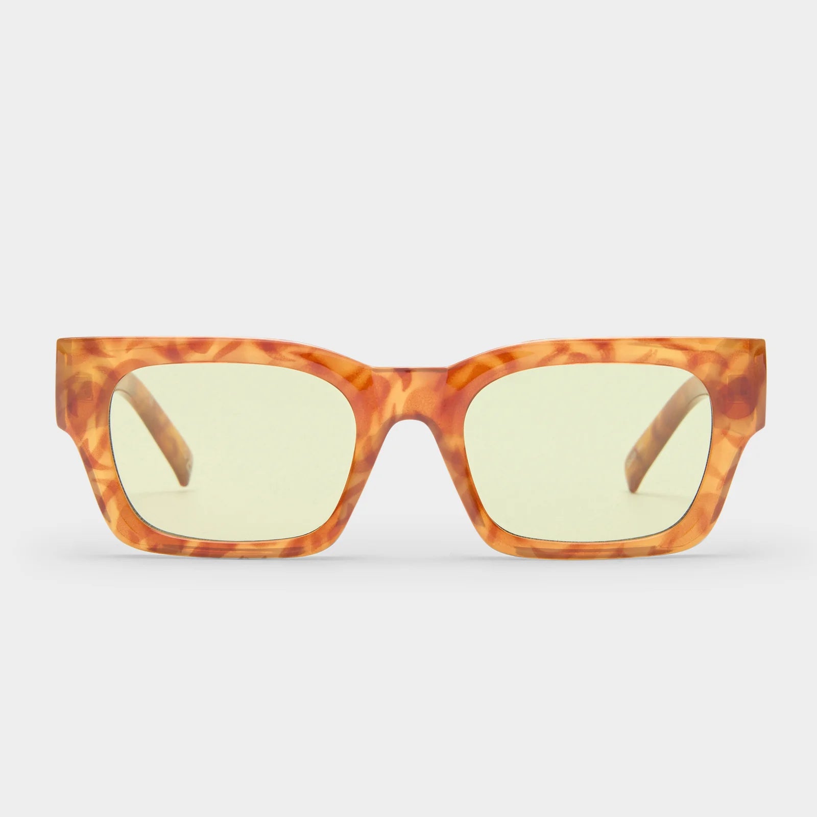 Finished in a unique brown and tan haze frame with contrast green lenses.