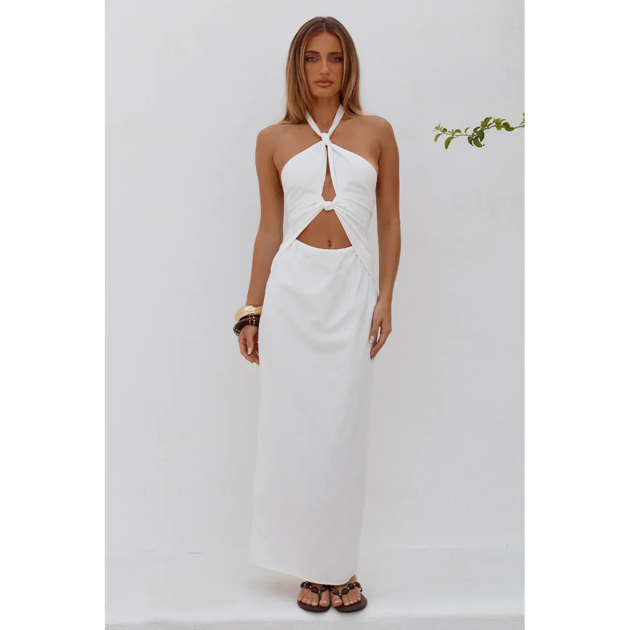 Elegant midi dress featuring a flattering halter neckline and discreet centre back invisible zipper. Crafted from a luxurious cotton and rayon blend, this lined piece offers a structured, non-stretch silhouette that drapes beautifully. The rayon lining ensures comfort against the skin. Perfect for sophisticated occasions, this timeless design combines classic styling with quality construction for an effortlessly polished look.