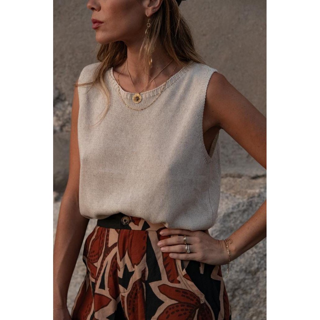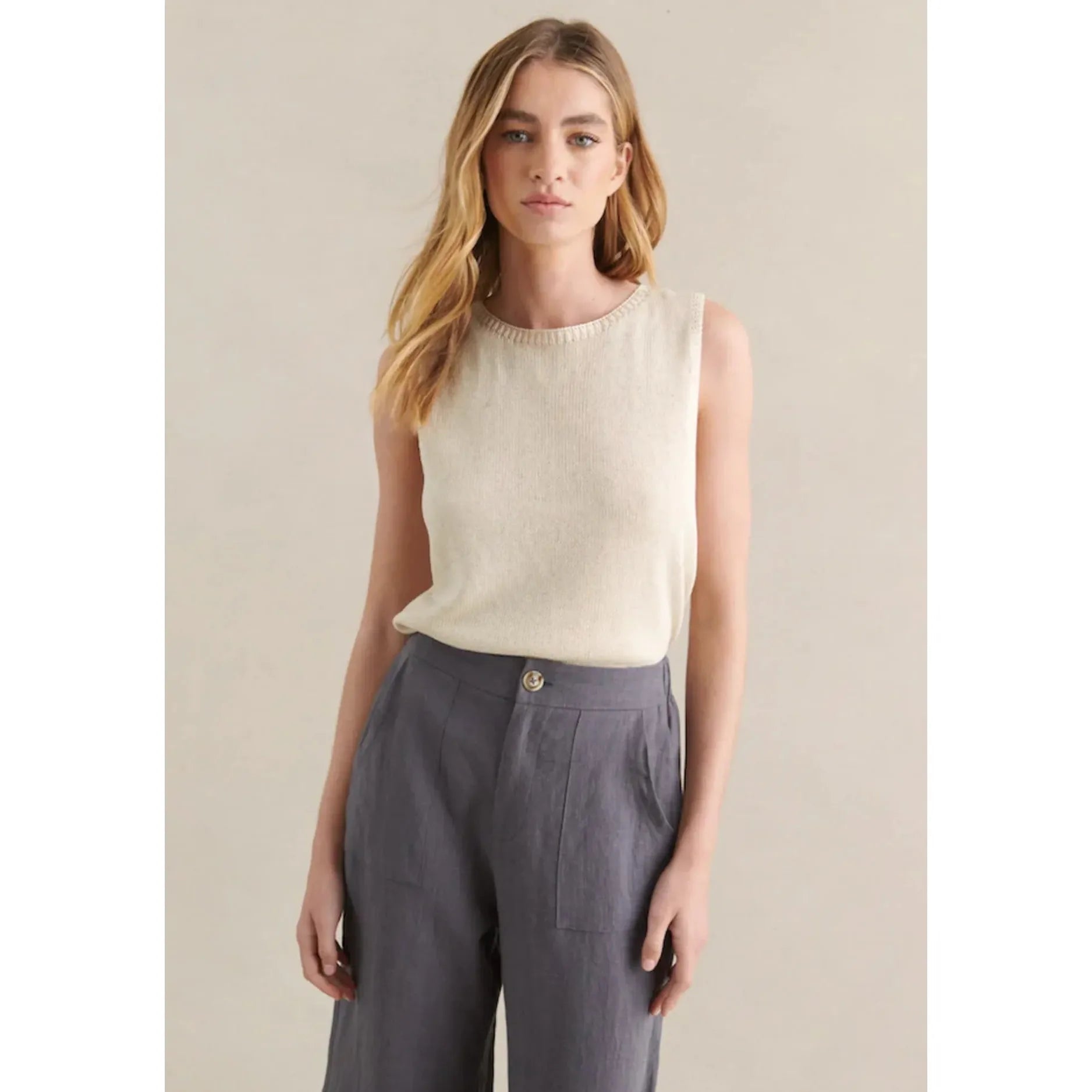 Introducing the Spring Tank by Little Lies. Perfect for any season, this effortlessly stylish and luxurious tank is crafted from a lightweight linen blend yarn for comfort and breathability. The relaxed silhouette and subtle ribbed accents make it versatile for endless styling possibilities. Elevate your wardrobe with this must-have piece.