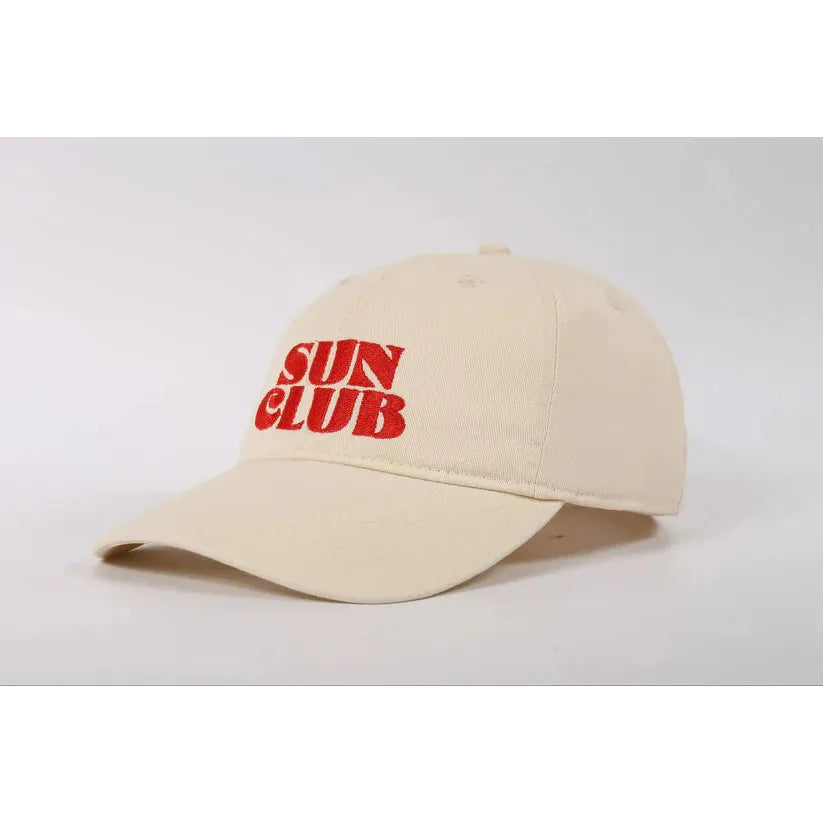 This unisex Sun Club Embroidered Cotton Cap features a stylish cream design with vibrant red embroidery, including the "Sun Club" logo on the front and three sun motifs on the adjustable strap. Crafted from breathable cotton, it offers comfort and durability. The adjustable strap ensures a secure fit for both men and women. For longevity, wash with mild detergent and avoid submerging in salt water. Ideal for sun protection with a distinctive, expert-crafted look.