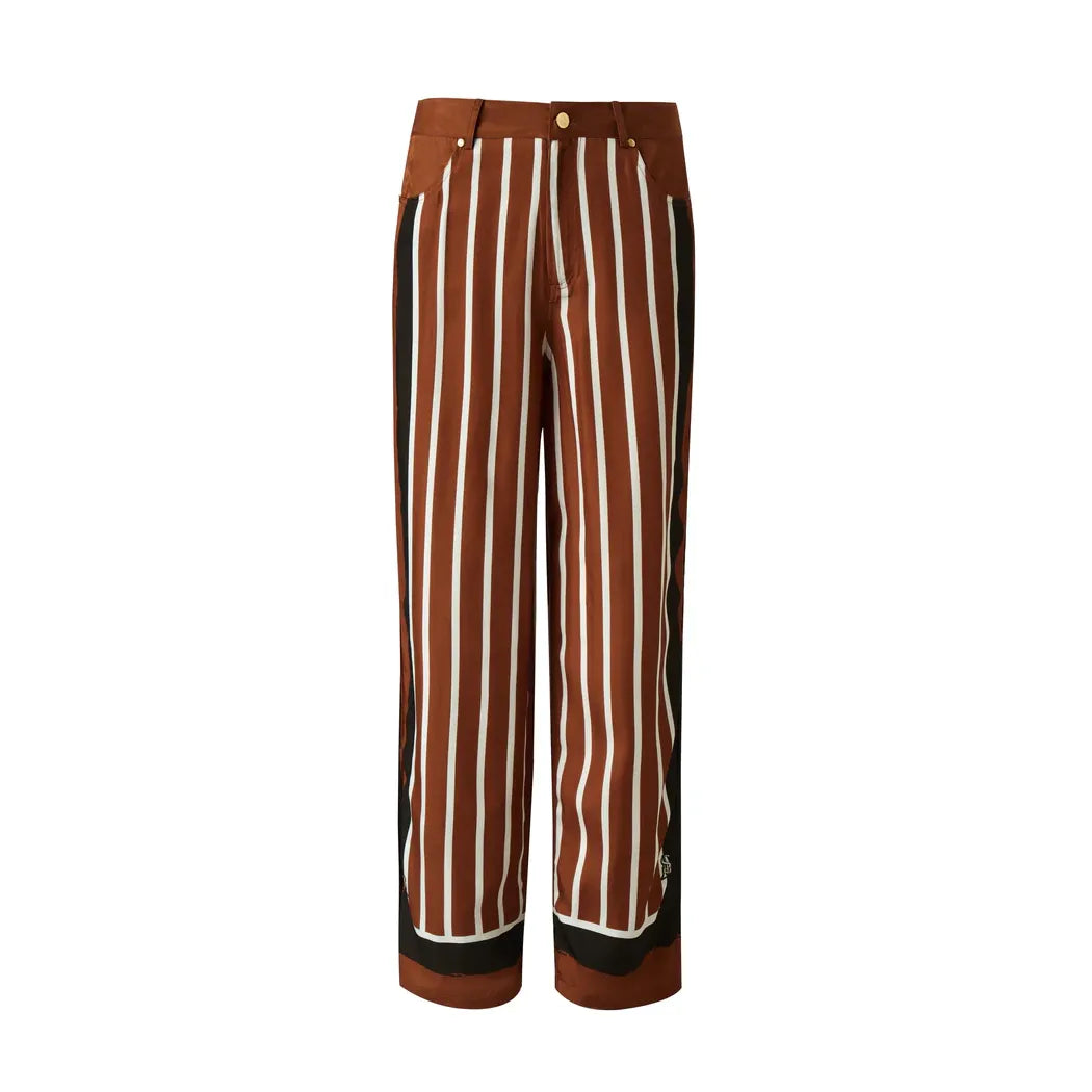 The Brixlynn Pants feature a full-length, mid-rise design with a straight leg cut and relaxed fit in a cherrywood stripe pattern. Made from 100% viscose, they require gentle hand washing in cold water, line drying in shade, warm ironing, and are drycleanable. Avoid tumble drying, bleaching, or soaking.