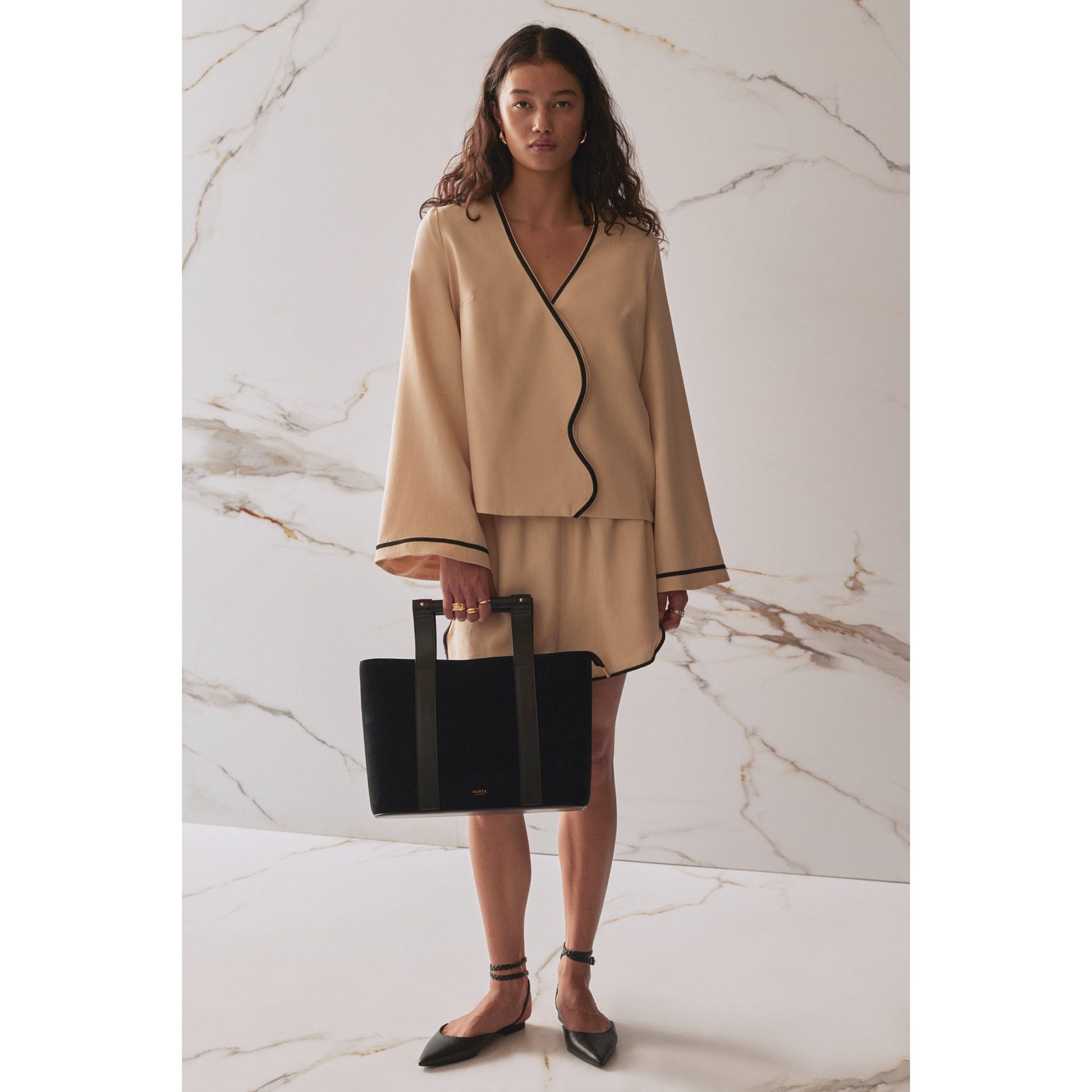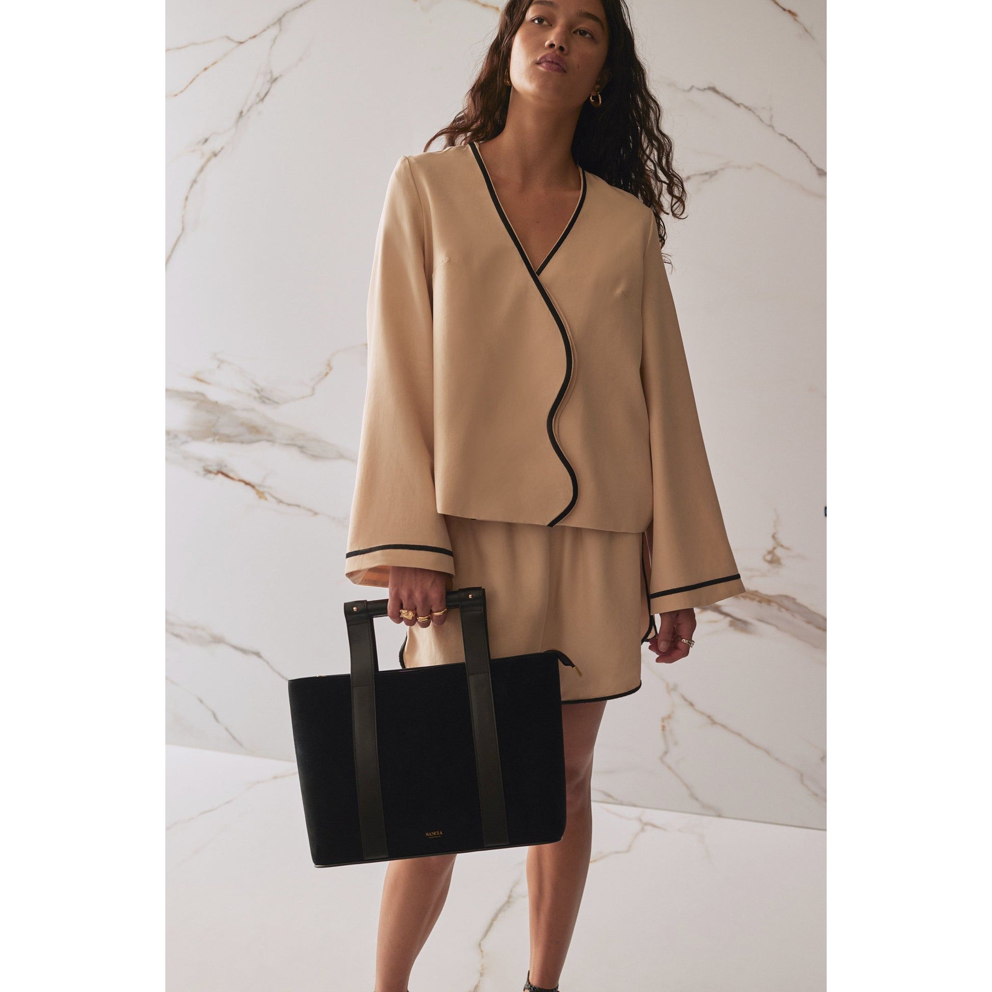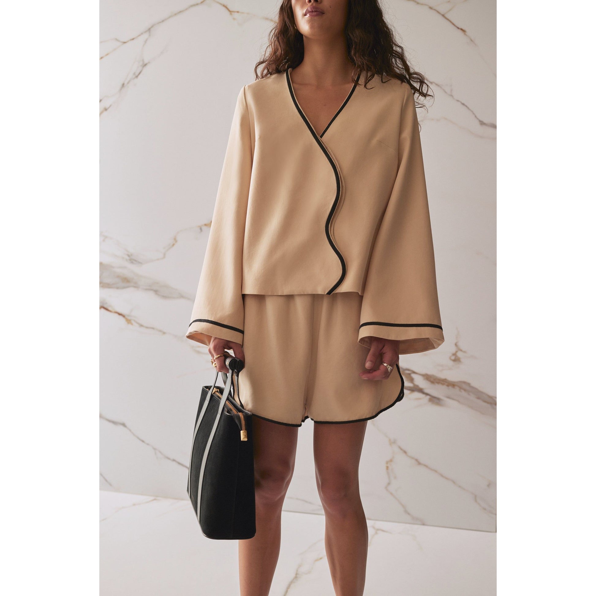 Relaxed fit shirt in fawn, fully lined with 100% rayon. Features a wavy front panel with hidden button closure and contrast embroidery/binding. Made from 100% Tencel Lyocell. Care: gentle hand wash cold, line dry in shade, warm iron, do not bleach or tumble dry, drycleanable.